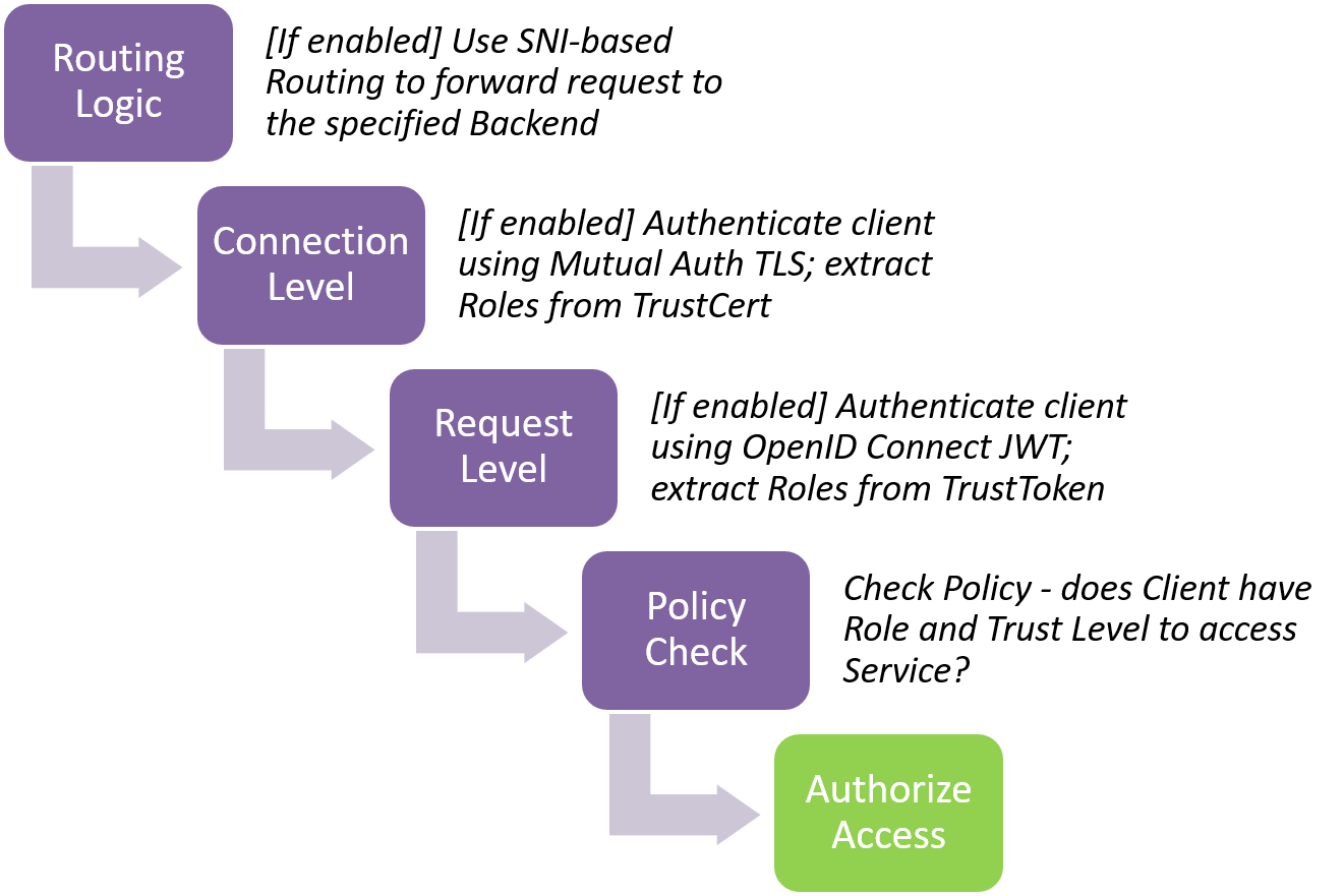 Policy Check - Once the Client has been authenticated, we compute the Roles and Trust Level. Policy is checked to ensure that this Client has permission to access the Service they are requesting.