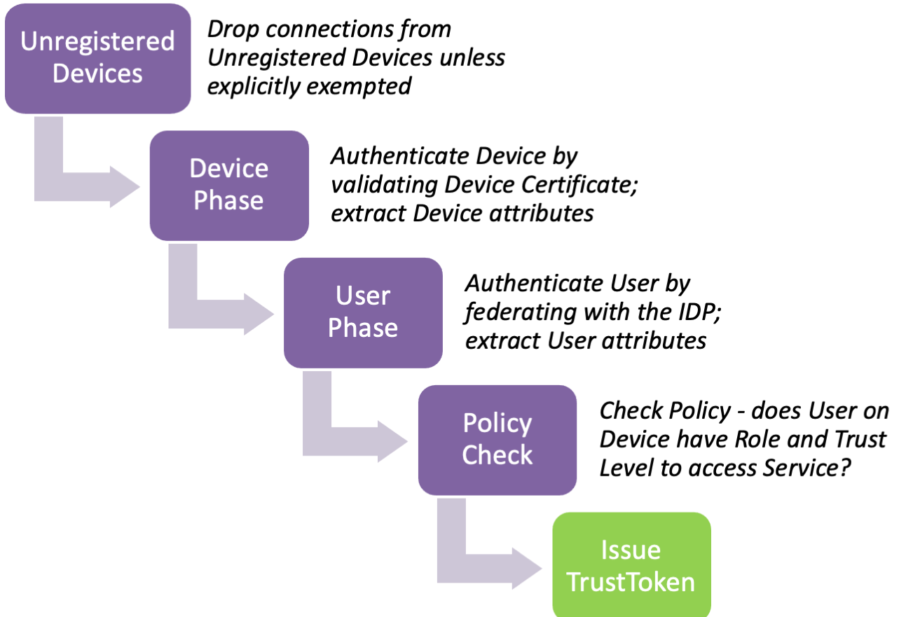 Policy Check - Once the Device and User have been authenticated, we compute the Roles and Trust Level for this User-Device combination. Policy is checked to ensure that this User-Device has permission to access the Service they are requesting.