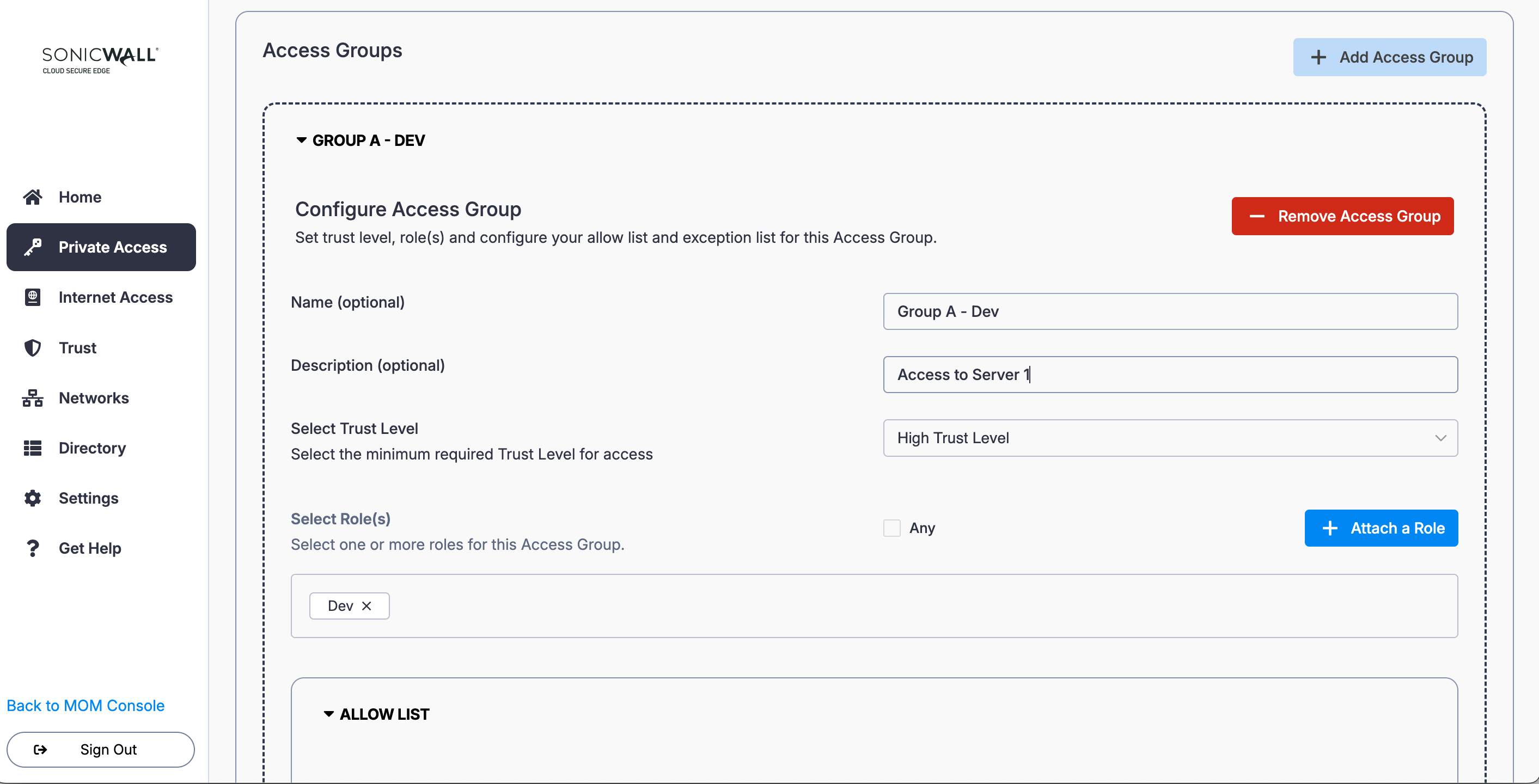 2. In the Access Group configuration, name the Access Group (i.e., Group A - Dev) and enter a meaningful description (i.e., Access to Server 1). Set a required device Trust Level.