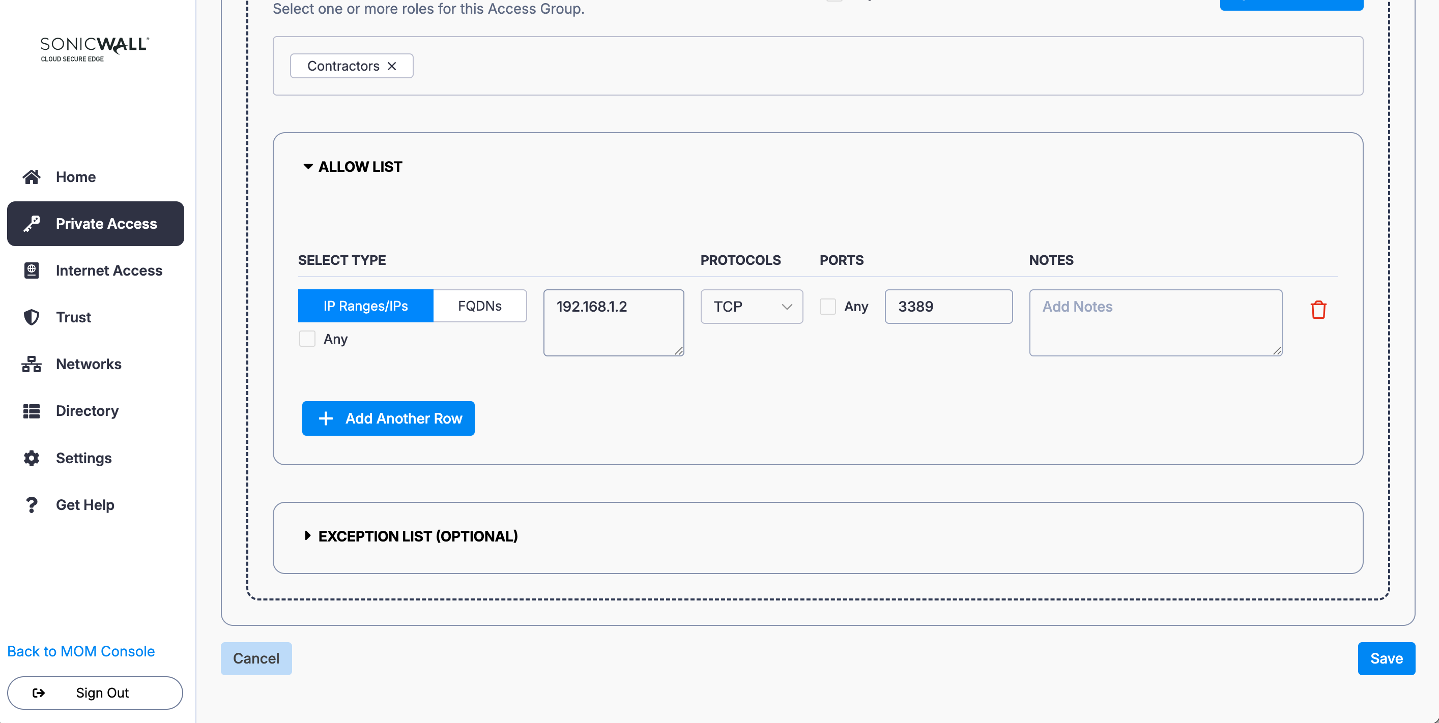 7. Under Allow List, select IP Ranges/IPs: Enter the IP of Server 2 (i.e., 192.168.1.2), select the relevant protocol and port (i.e., 3389).