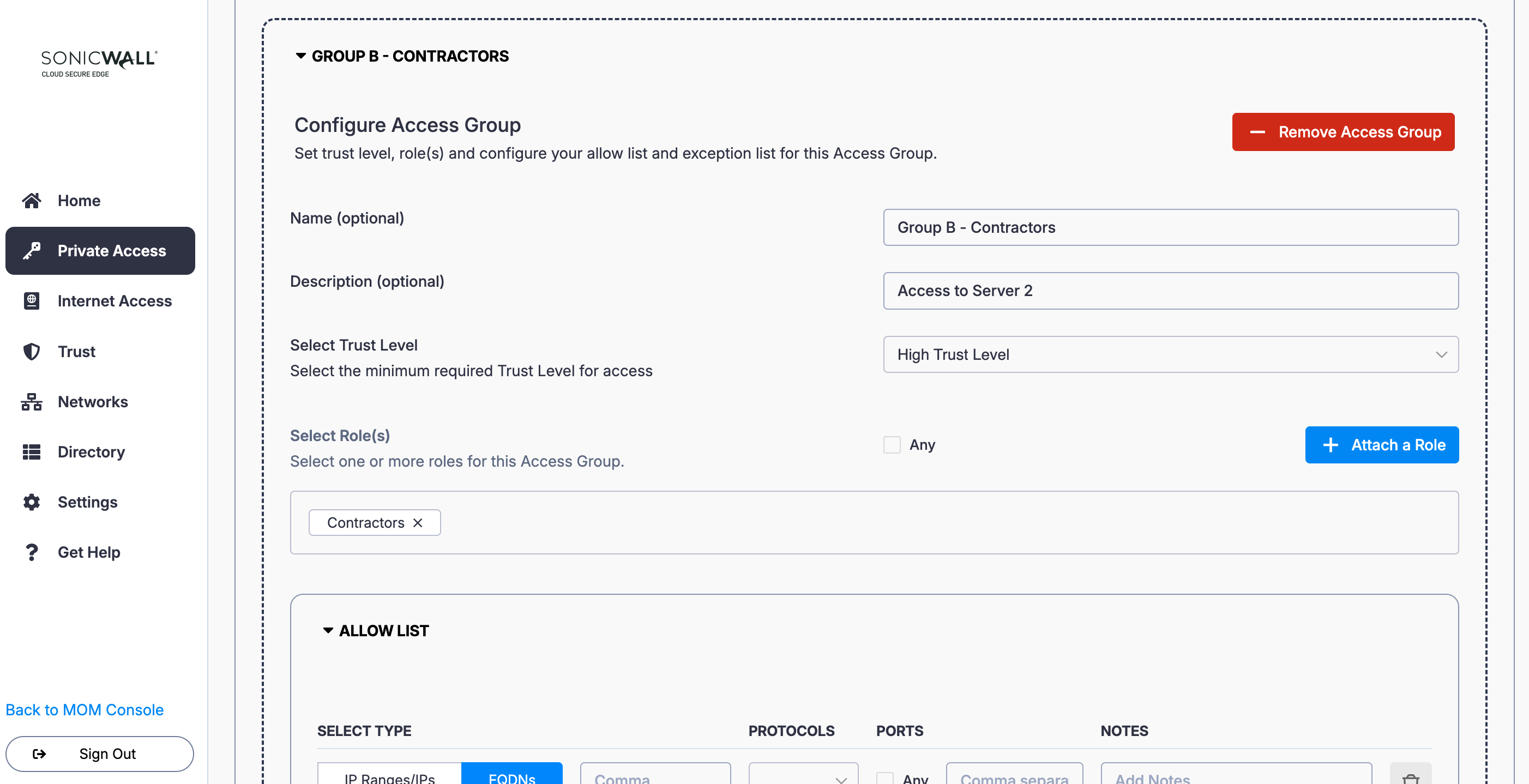 5. Add a second Access Group (i.e., select the + Add Access Group button again): Name the Access Group (i.e., Group B - Contractors) and enter a meaningful description (i.e., Access to Server 2). Set a required device Trust Level.