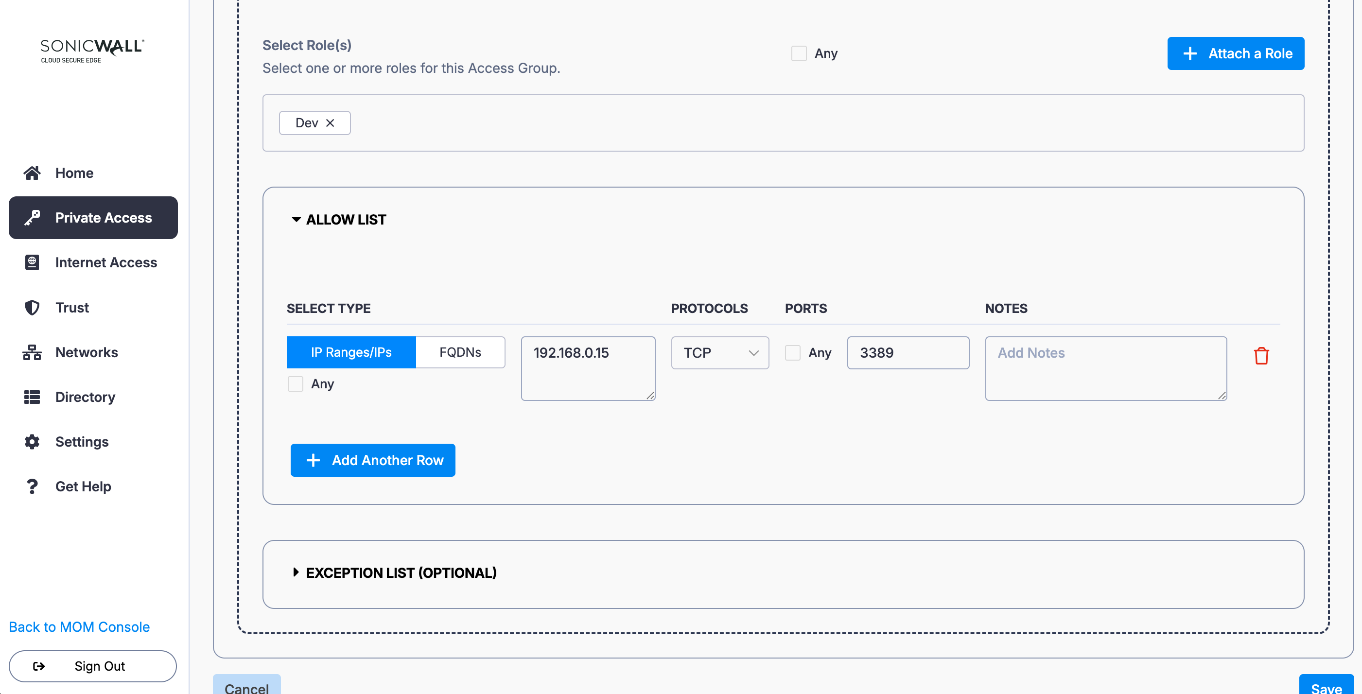 8. Under Allow List, select IP Ranges/IPs: Enter the IP 192.168.168.168, and select the relevant protocol and port.