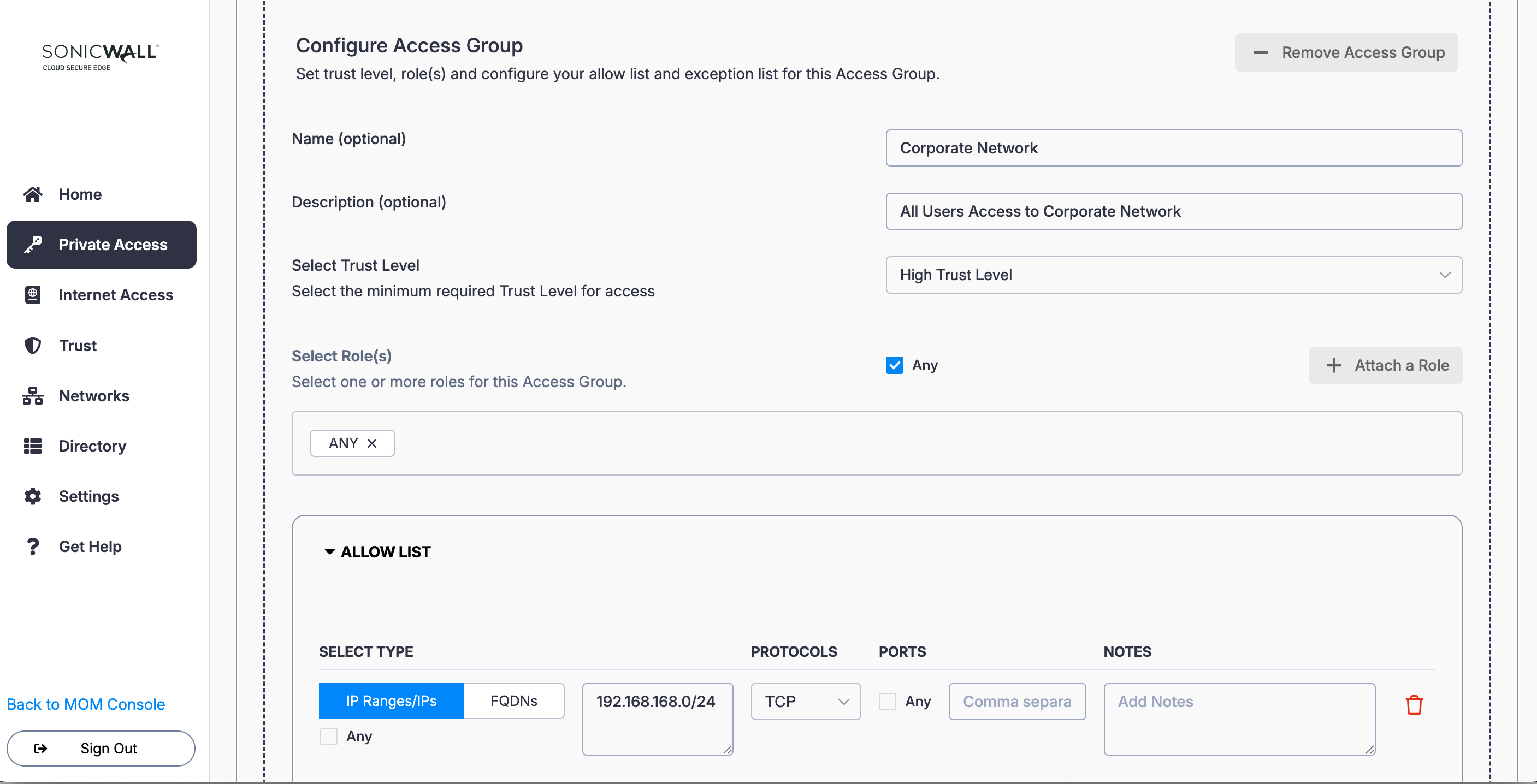 2. In the Access Group configuration, name the Access Group (i.e., Corporate Network) and enter a meaningful description (i.e., Users Access to Corporate Network). Set a required device Trust Level.