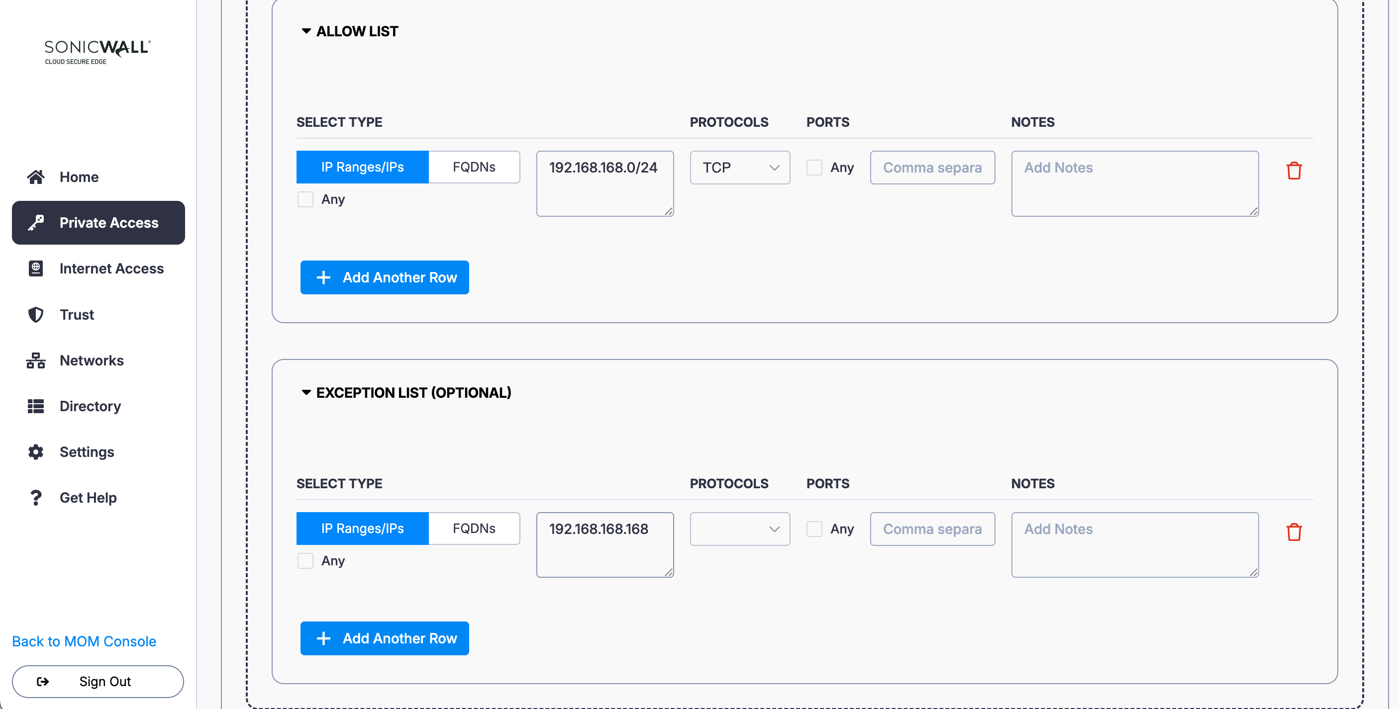 8. Under Allow List, select IP Ranges/IPs: Enter the private network IP range (i.e., 192.168.168.0/24), and select the relevant protocol (i.e., TCP) and port.