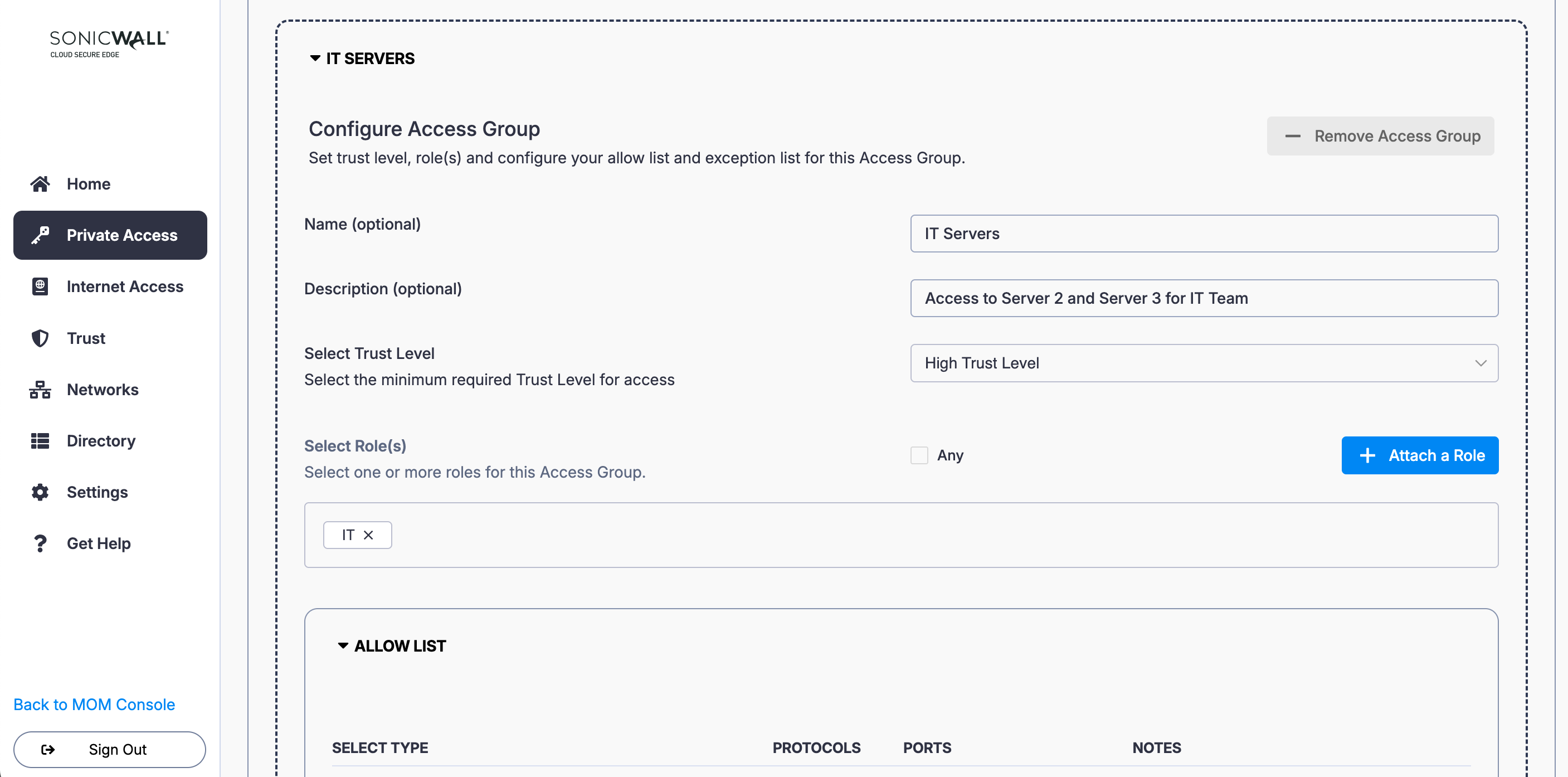 5. Add a second Access Group (i.e., select the + Add Access Group button again): Name the Access Group (i.e., IT Servers) and enter a meaningful description (i.e., Access to Server 2 and Server 3 for IT Team). Set a required device Trust Level.
