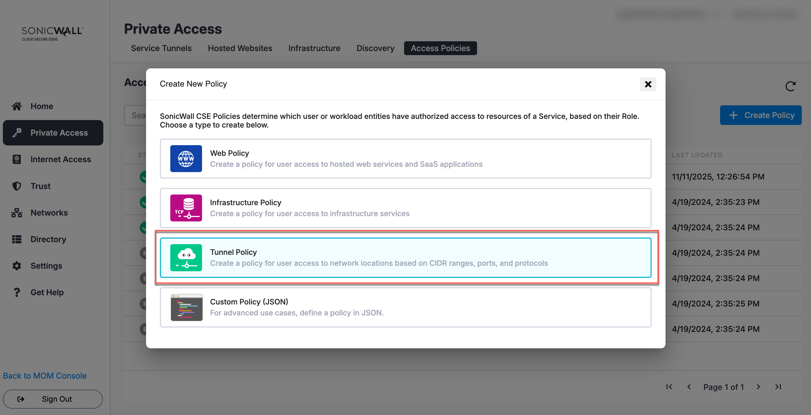 Tunnel Policies define user access to network locations based on CIDR ranges, ports, and protocols from a Service Tunnel.