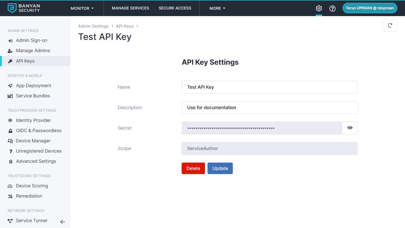 To use API key authentication, create an API key in the Command Center by navigating to Settings > API Keys and select Add API Key. Enter in a descriptive API Key Name and Scope, and store the returned API Key Secret securely.