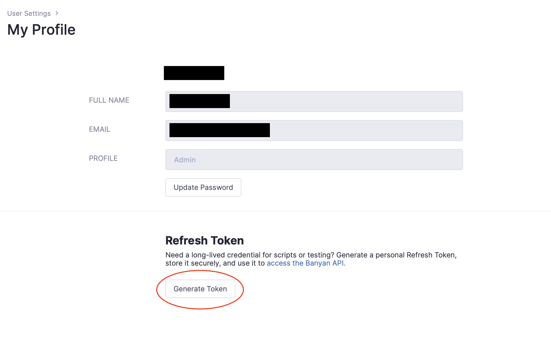 To generate a Personal Refresh Token, log into your instance of the Command Center; navigate to the My Profile page, and then select Generate Token.