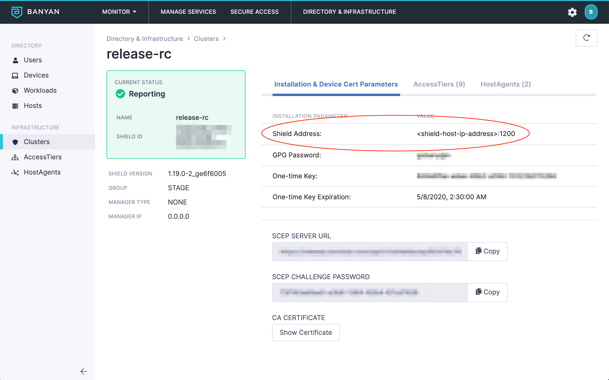 In the Banyan Command Center, navigate to Networks > Clusters and ensure you have a Cluster with a running Shield that the Netagent or Access Tier can connect to. The Clusters section of the Web Console lists all cluster parameters such as Cluster Name, Shield Address, etc.