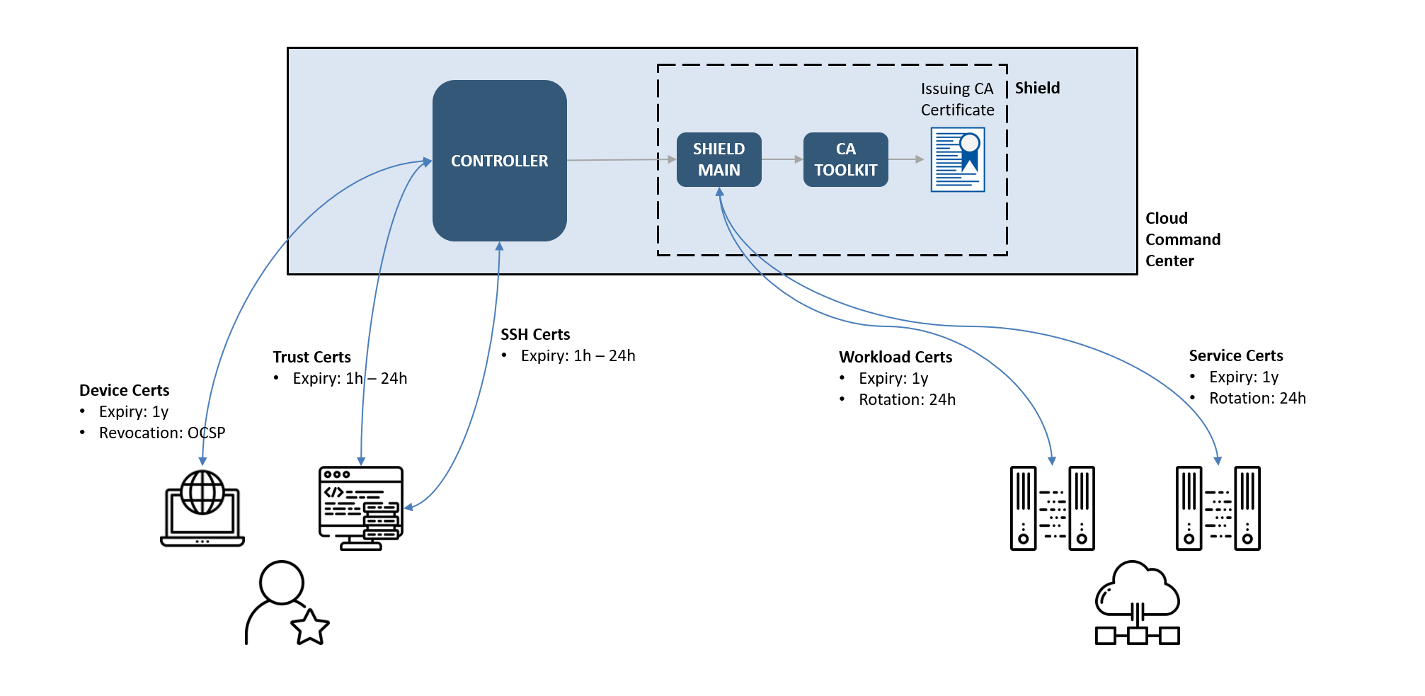 As in the diagram below, the CSE component called Shield manages a private PKI (Public Key Infrastructure), also known as an Internal CA (Certificate Authority), to distribute cryptographic identities (typically X.509 Certificates) to clients and services in your organization.