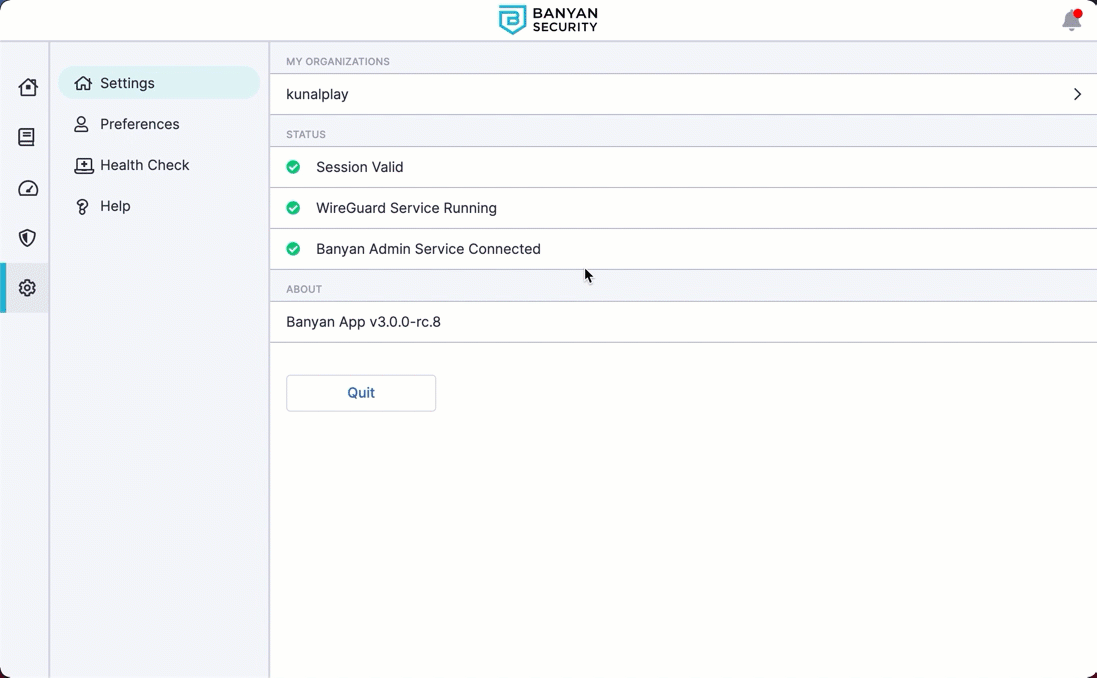 In Settings, end users can view the status of their session and services (e.g., WireGuard Service and Admin Service).