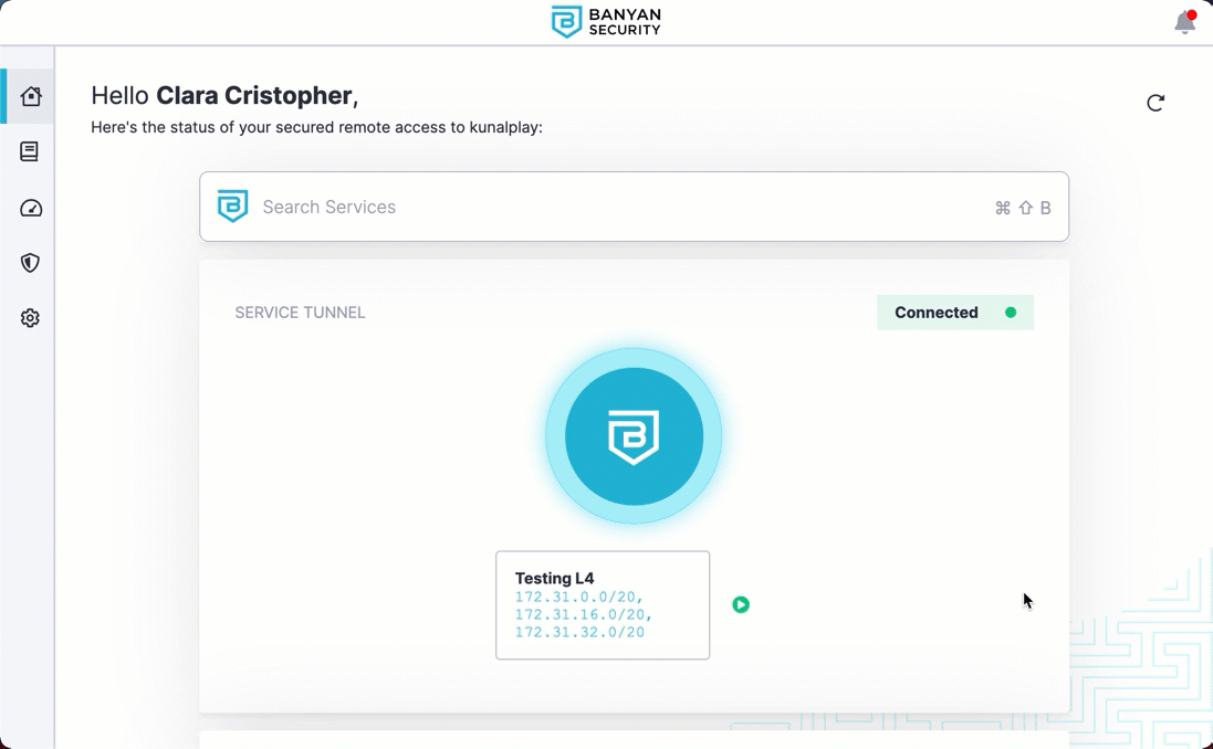 On the Home tab, end users can view Services, Service Tunnels, and Active Connections in a single location. Home tabs are tailored to the end user’s Role in their org.