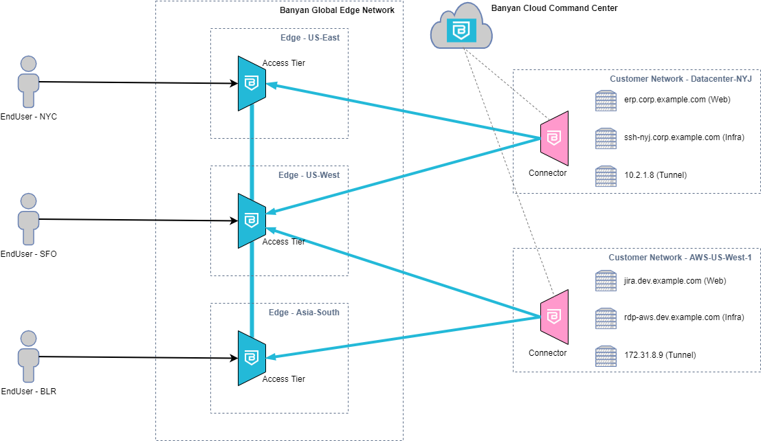 {orgname}.banyanops.com- for every organization that is provisioned in the Global Edge Network. The Org Domain resolves via Public DNS (which is configured using geo-proximity routing) to your organization’s Access Tiers managed in the Global Edge Network. -