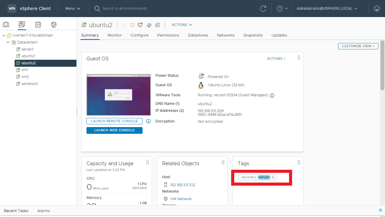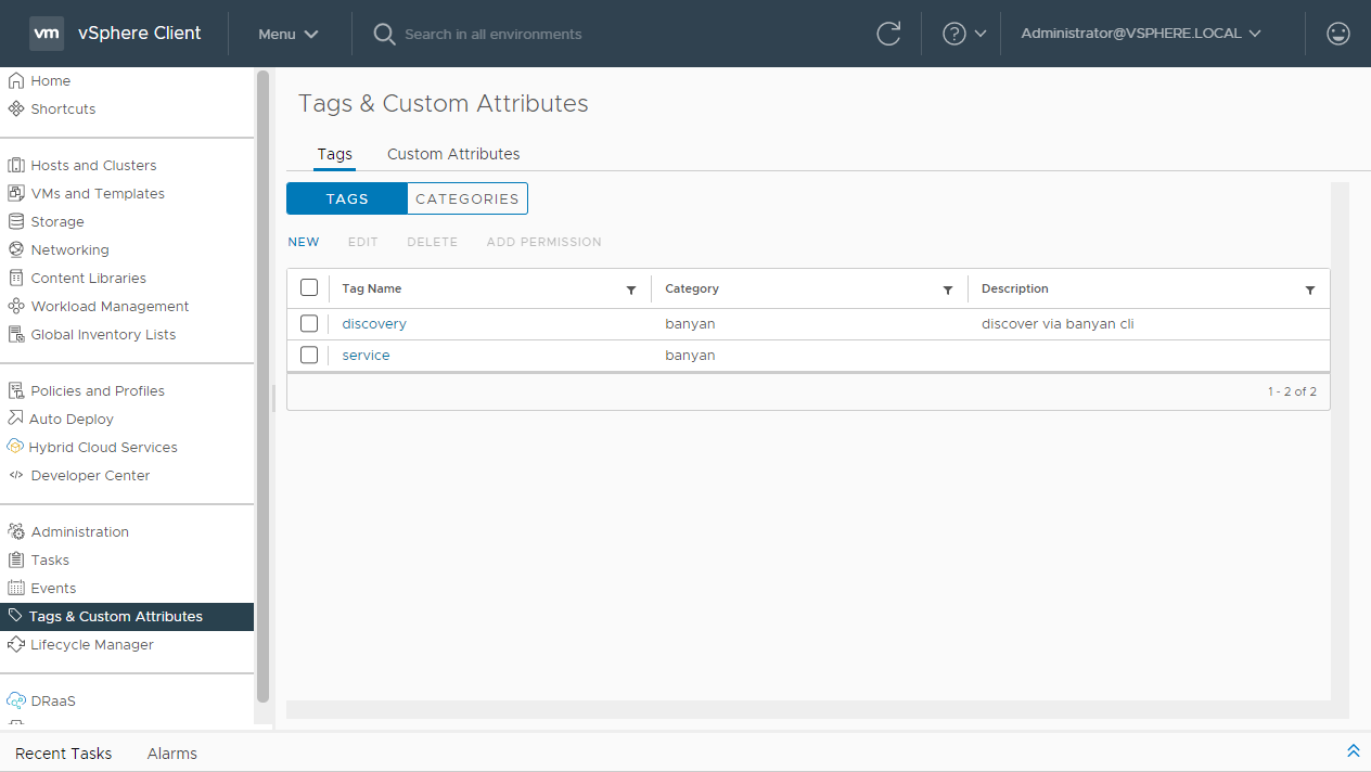 In the VMware vSphere management console, add tags to the resources you need to discovered by CSE. For this guide, we use the category banyan and the tag discovery to label resources that should be discovered by CSE, but you can use any category and tag for this purpose.