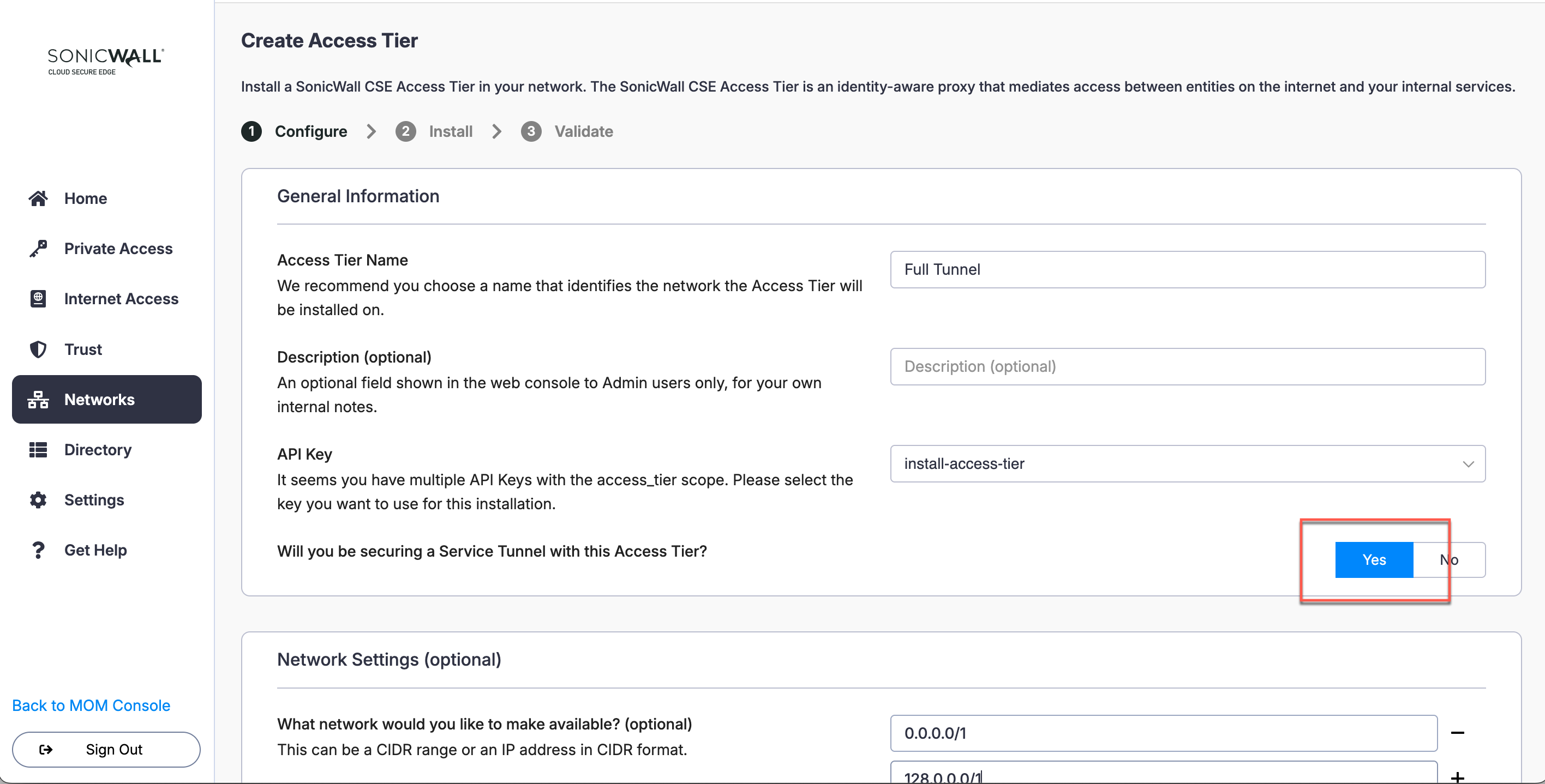 1.2 Under the Access Tier Configure tab, ensure that Yes is selected for Will you be securing a Service Tunnel with this Access Tier?.