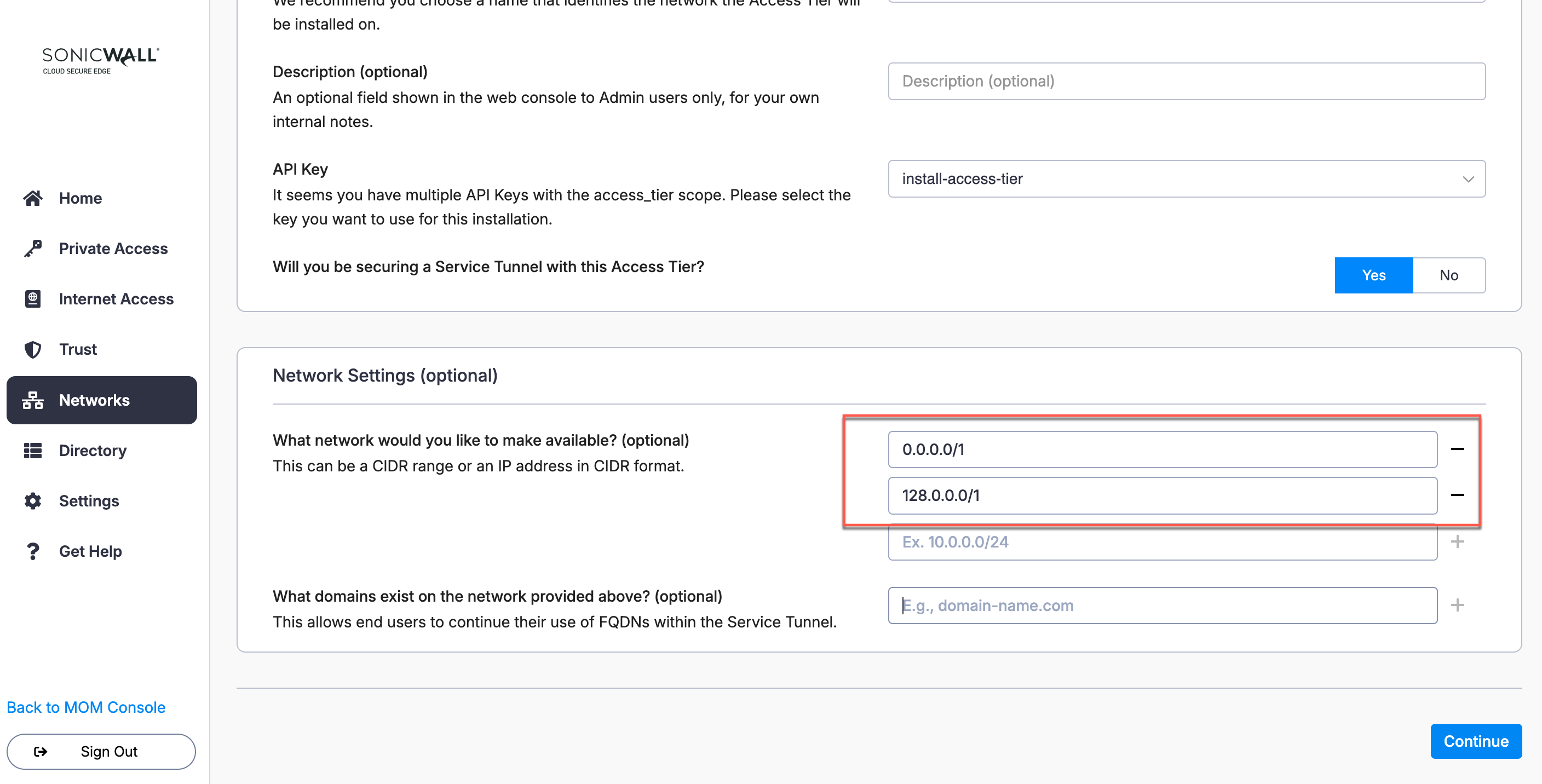 1.3 Under Network Settings > What network would you like to make available?, enter 0.0.0.0/1 as the first CIDR range entry, then add another and enter 128.0.0.0/1 as the second CIDR range entry.