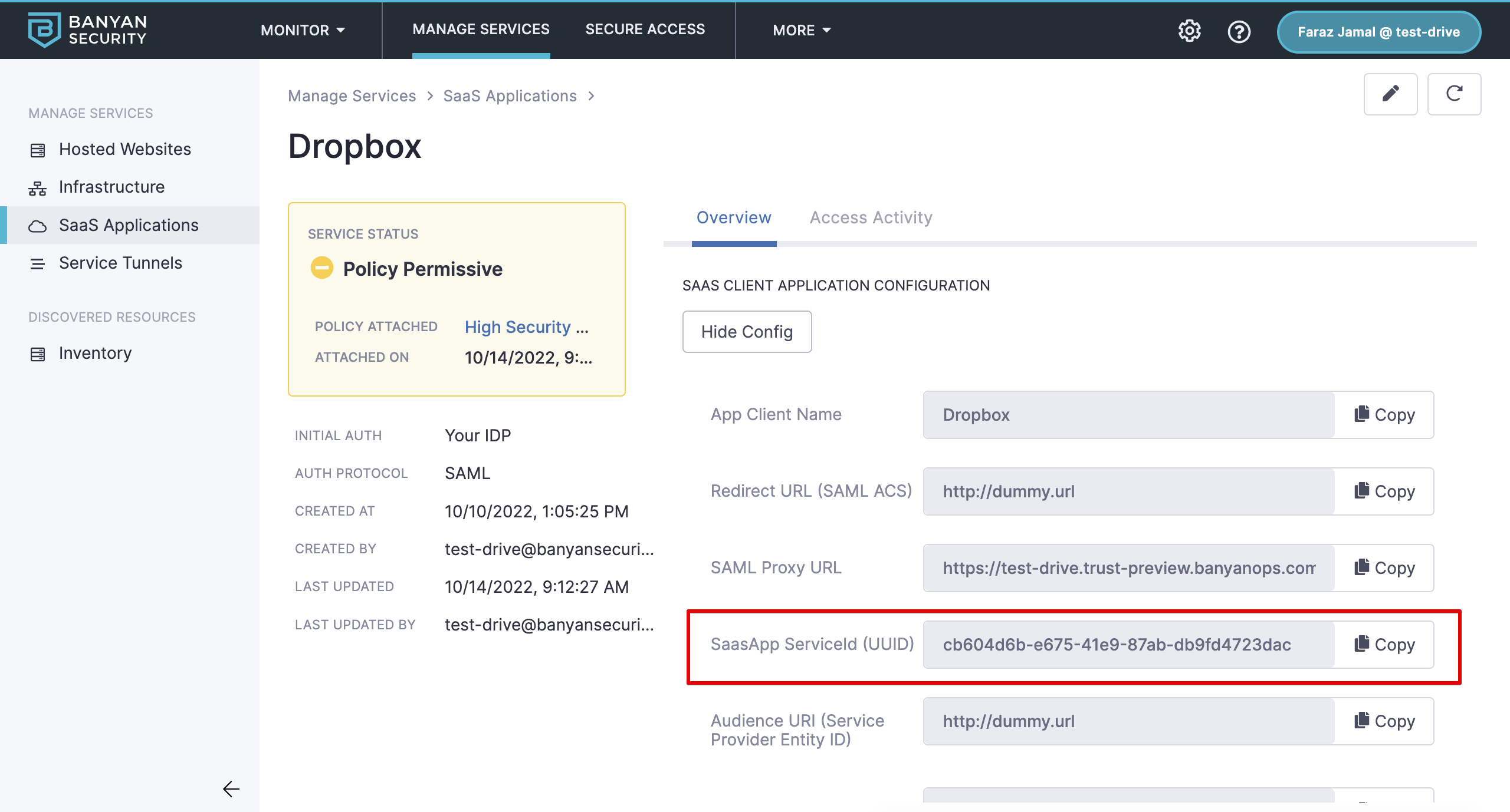 - serviceid: Copy Saas App Service ID from your newly published SaaS app’s service spec in CSE, and paste in adjacent field.
