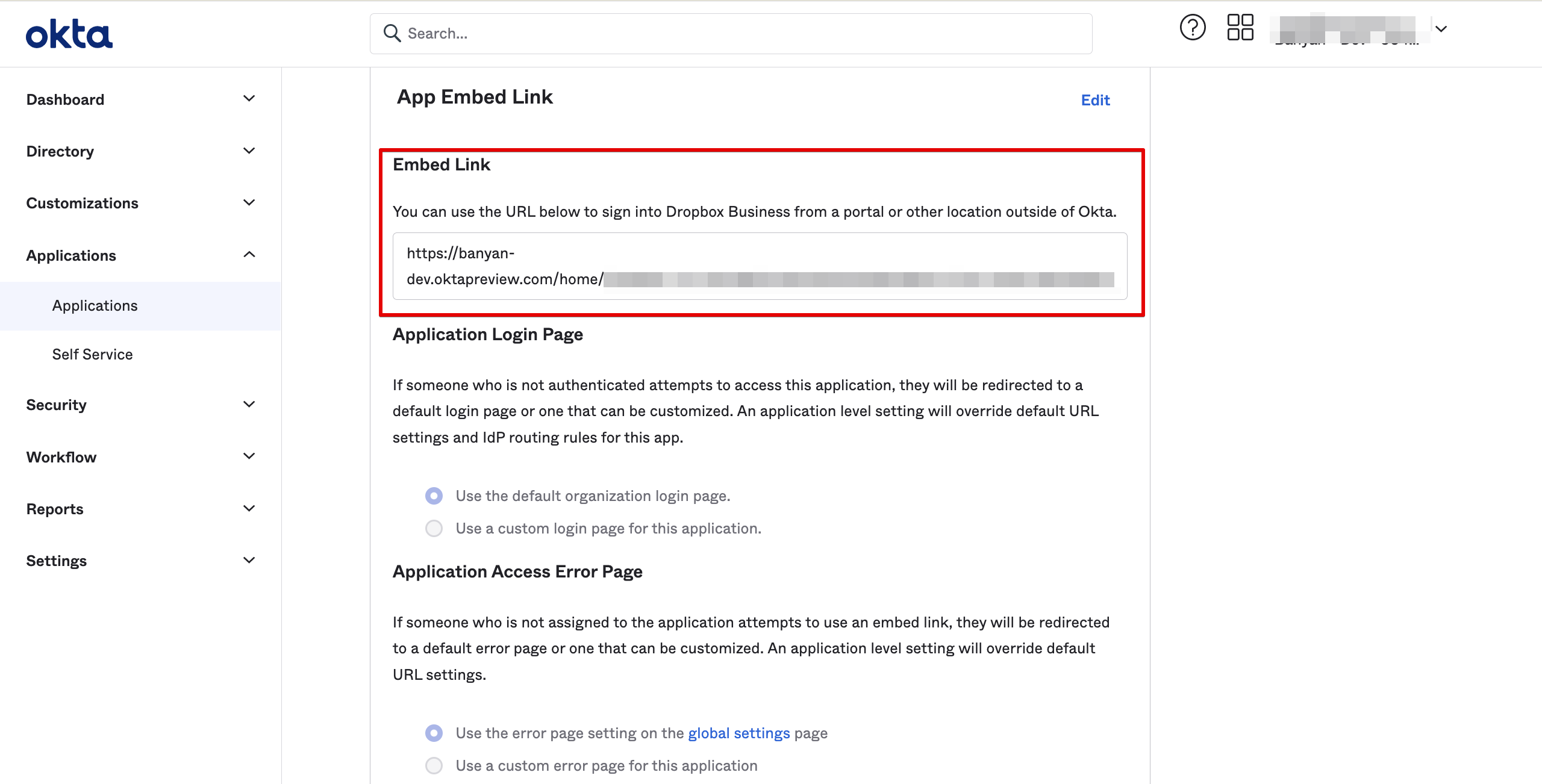 The shadow application will show up in the Okta catalog and ensure that a CSE device trust check is complete regardless of an existing Okta session. For these steps, we will use Dropbox as the example SaaS application.