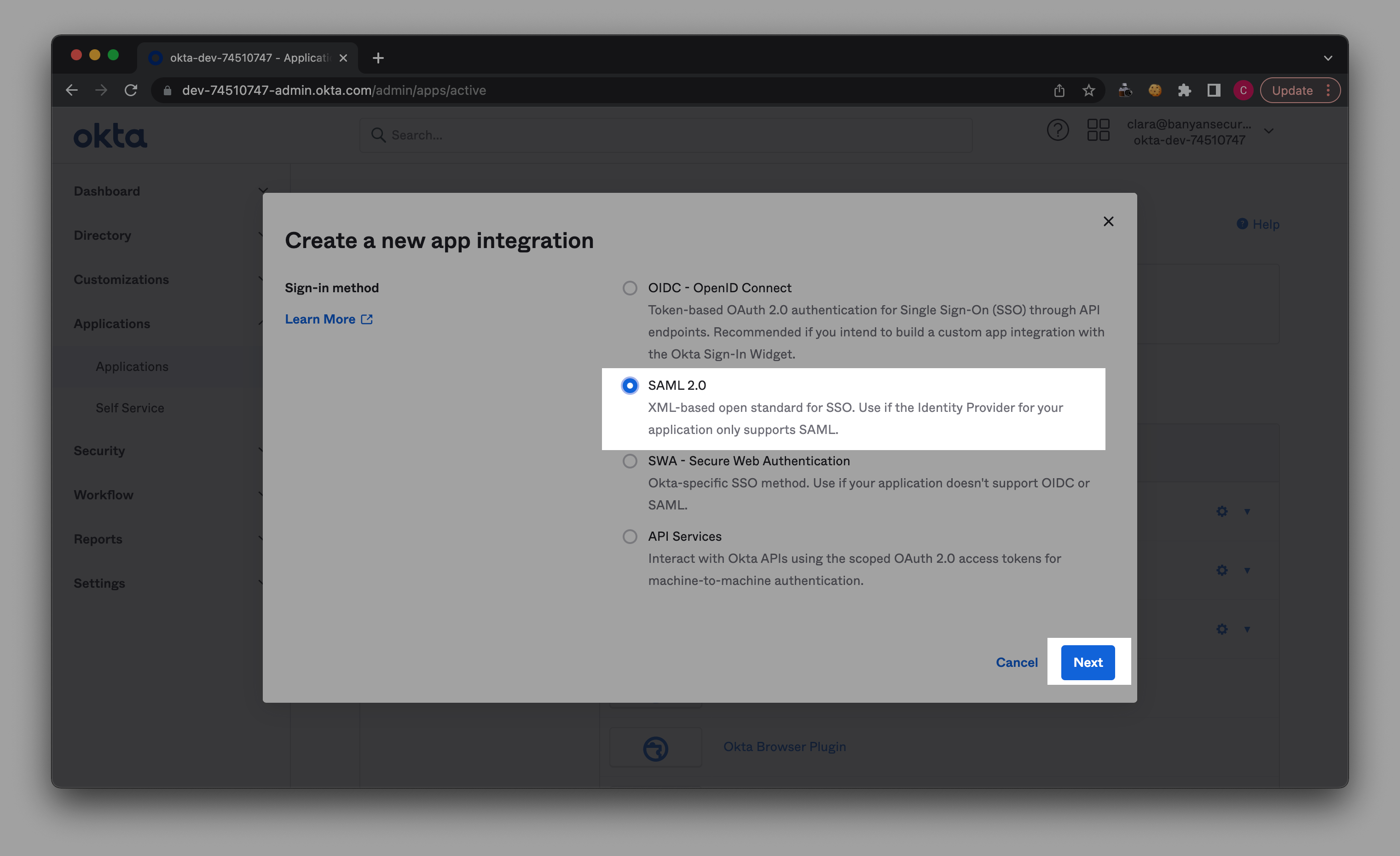 2.2 Select Create App Integration and choose SAML 2.0.