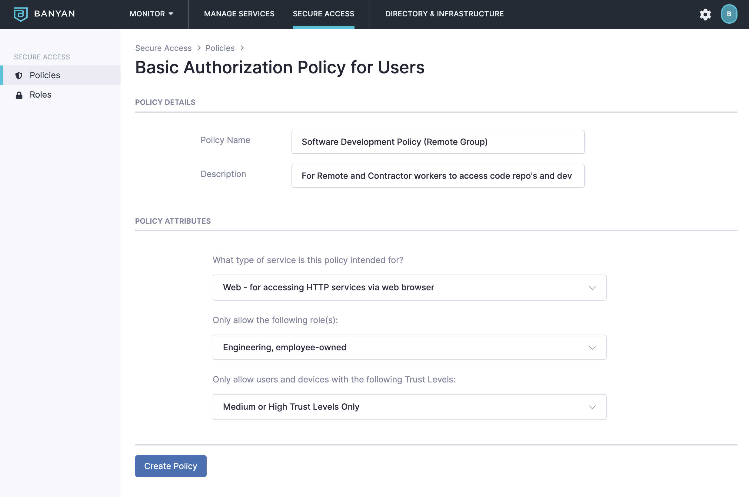 The example below shows an example Access Policy that only grants access for web services to the Engineering and employee-owned Roles (those which only include members of the engineering team who own their own registered devices). Users with these Roles must have at least Medium or High Trust Levels to access the applicable service(s).