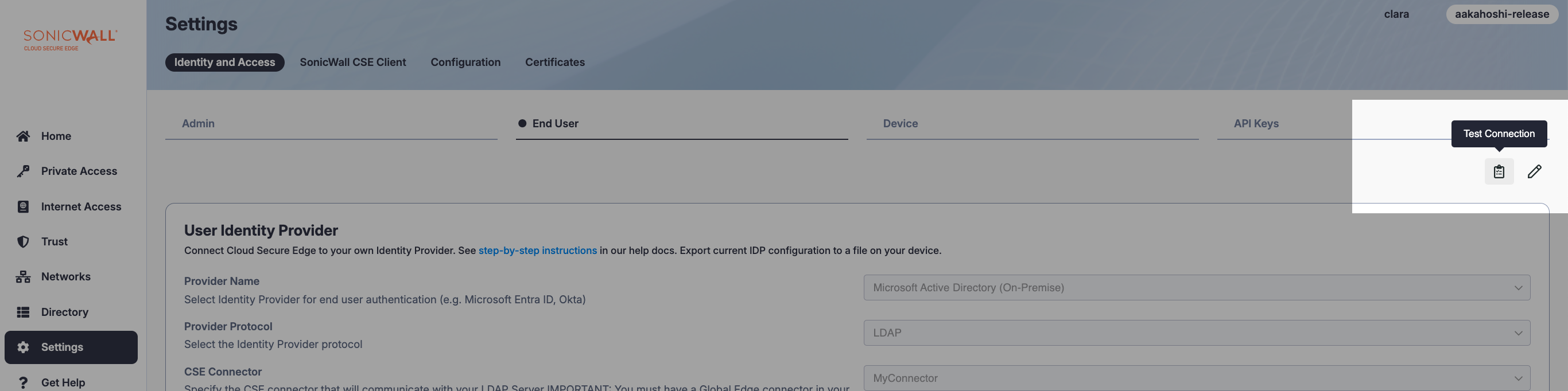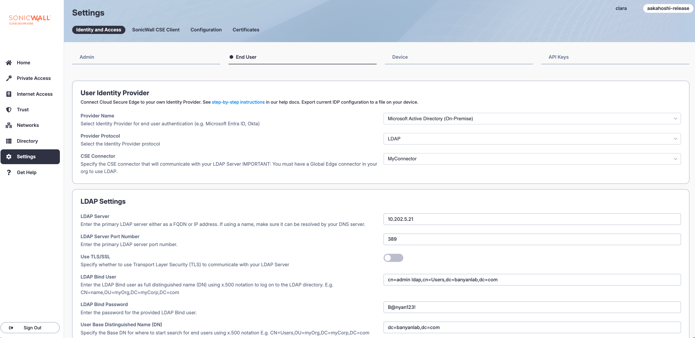 1.1 In the Cloud Secure Edge Command Center, navigate from Settings > Identity and Access > End User, and select Microsoft Active Directory (On Premise) as the Provider Name.