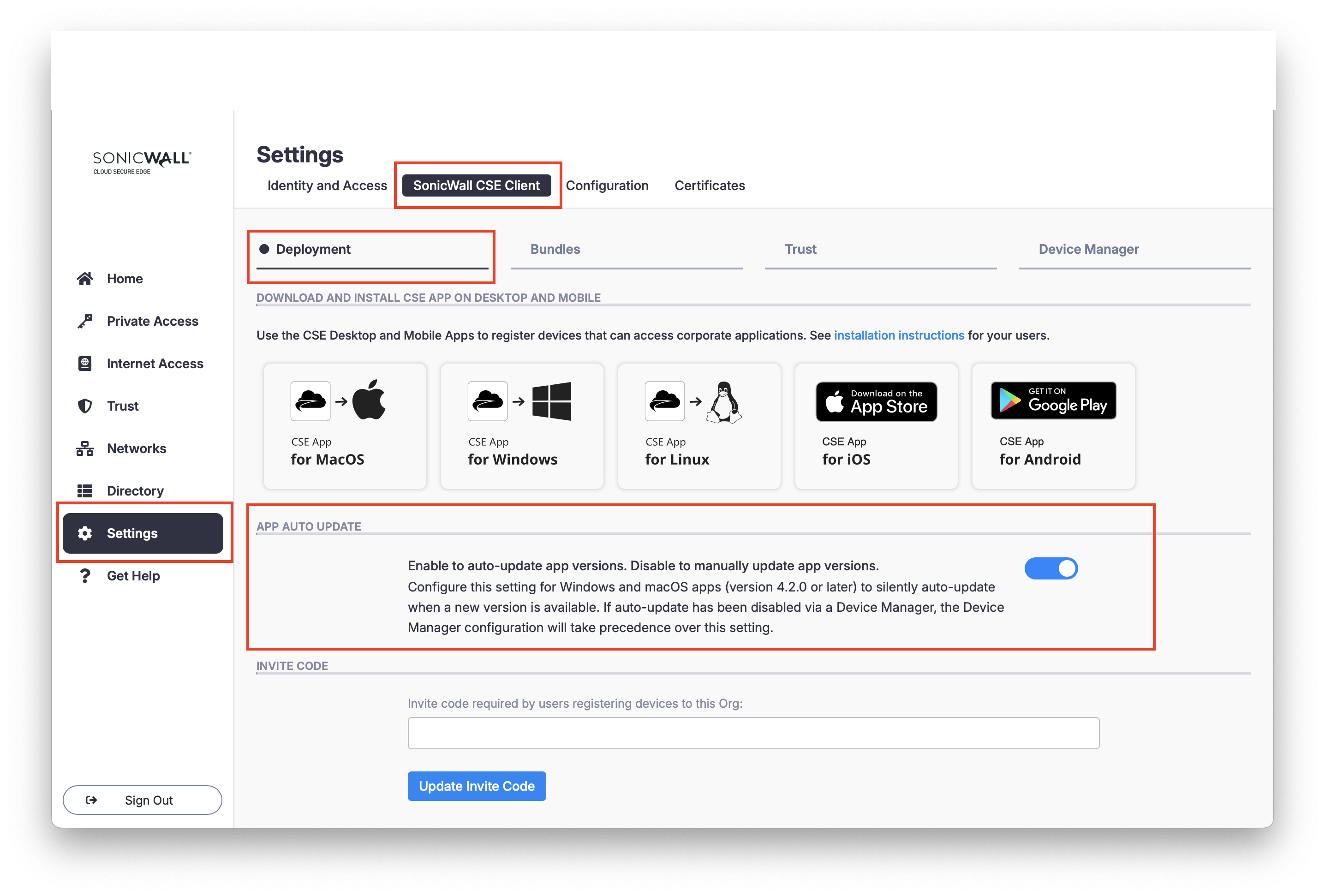 In the CSE Command Center, navigate from Settings > SonicWall CSE Client > the Deployment tab.