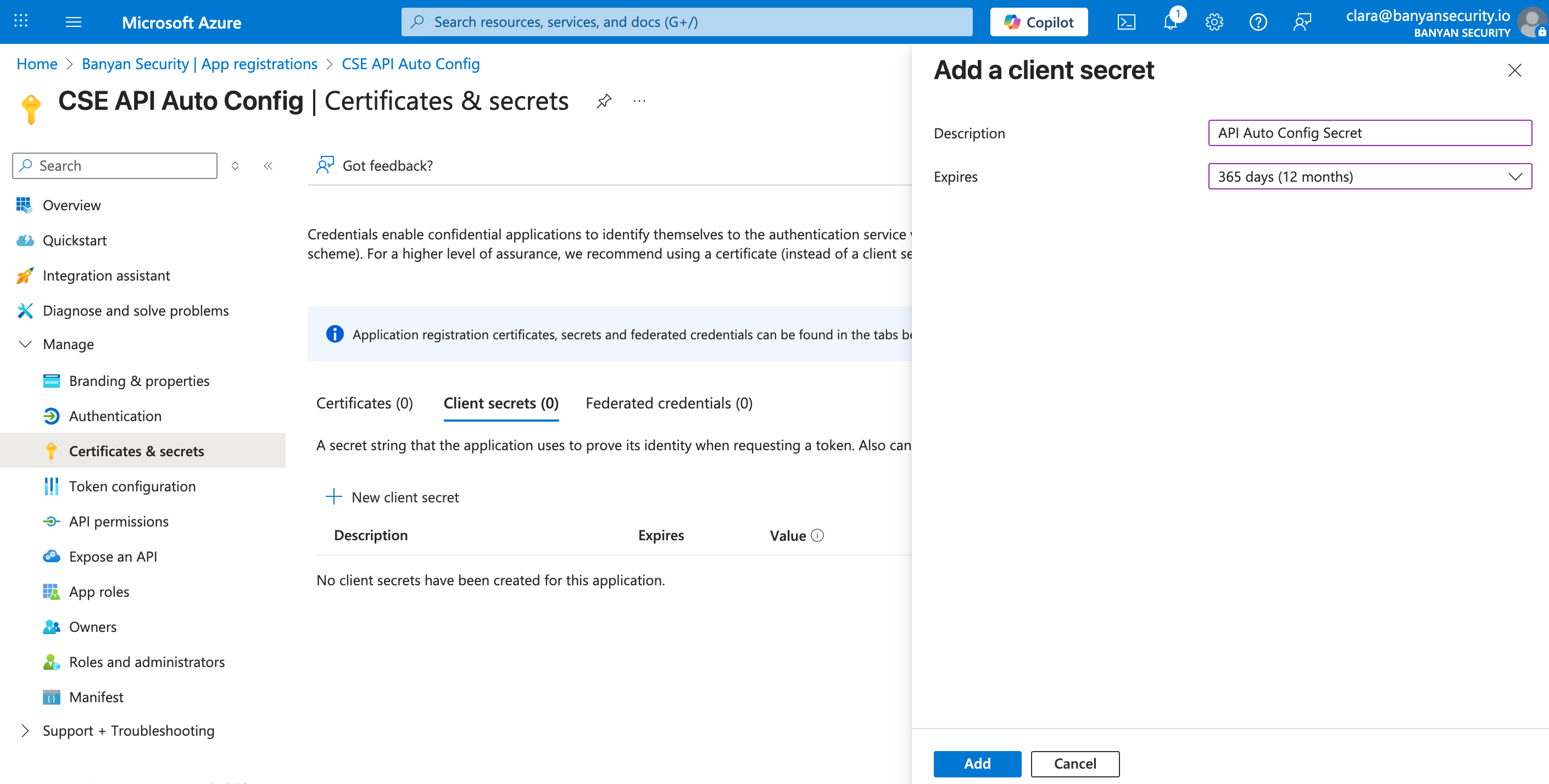 2.9 Under Add a client secret, enter API Auto Config Secret in the Description field.