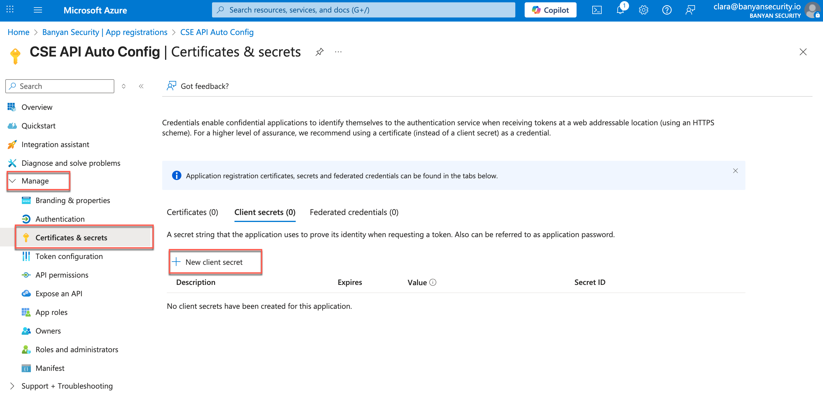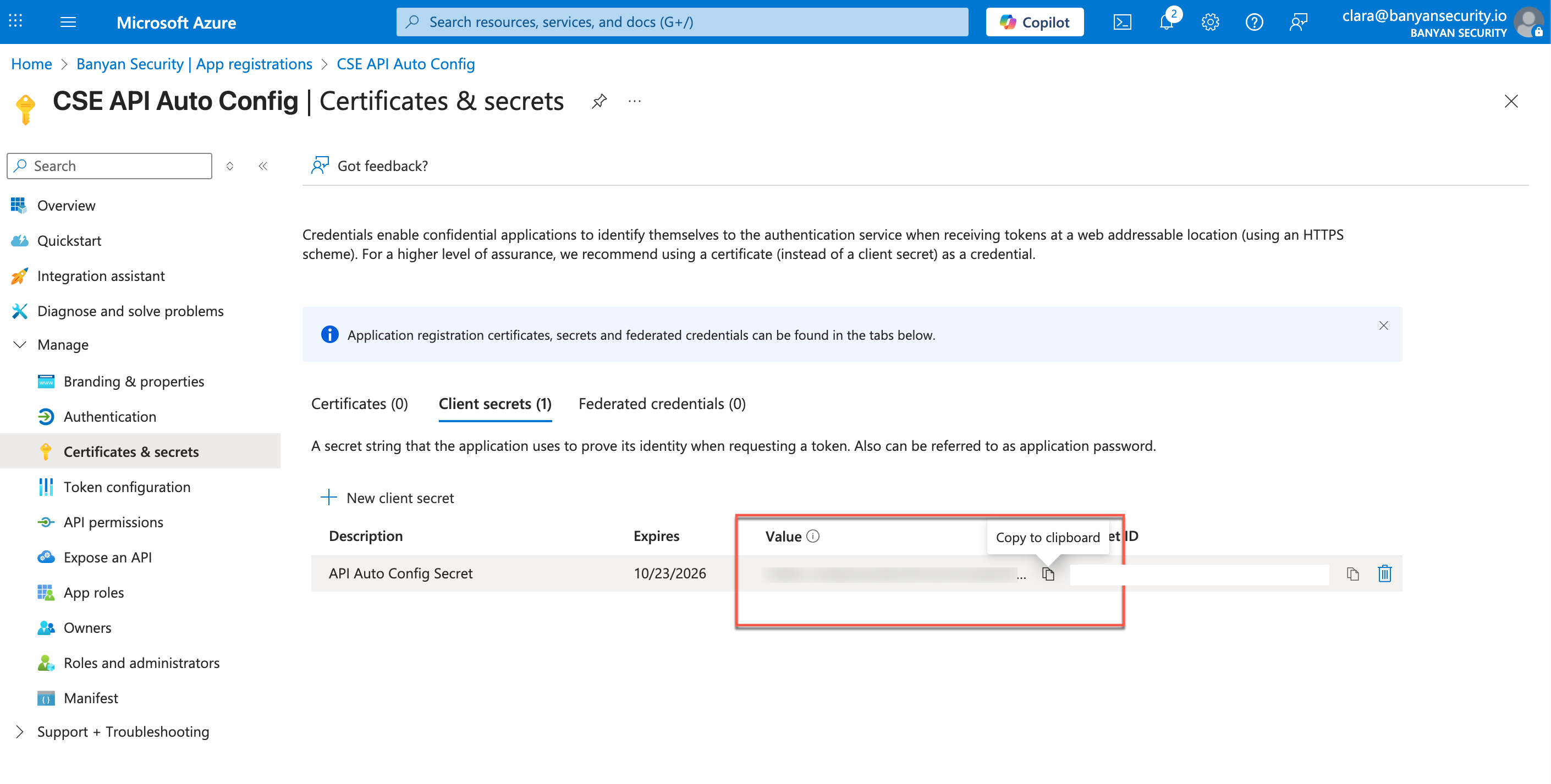 2.12 Under Certificates and secrets, the new client secret will be listed. Copy its Value, and paste this value into the Secret field in CSE.