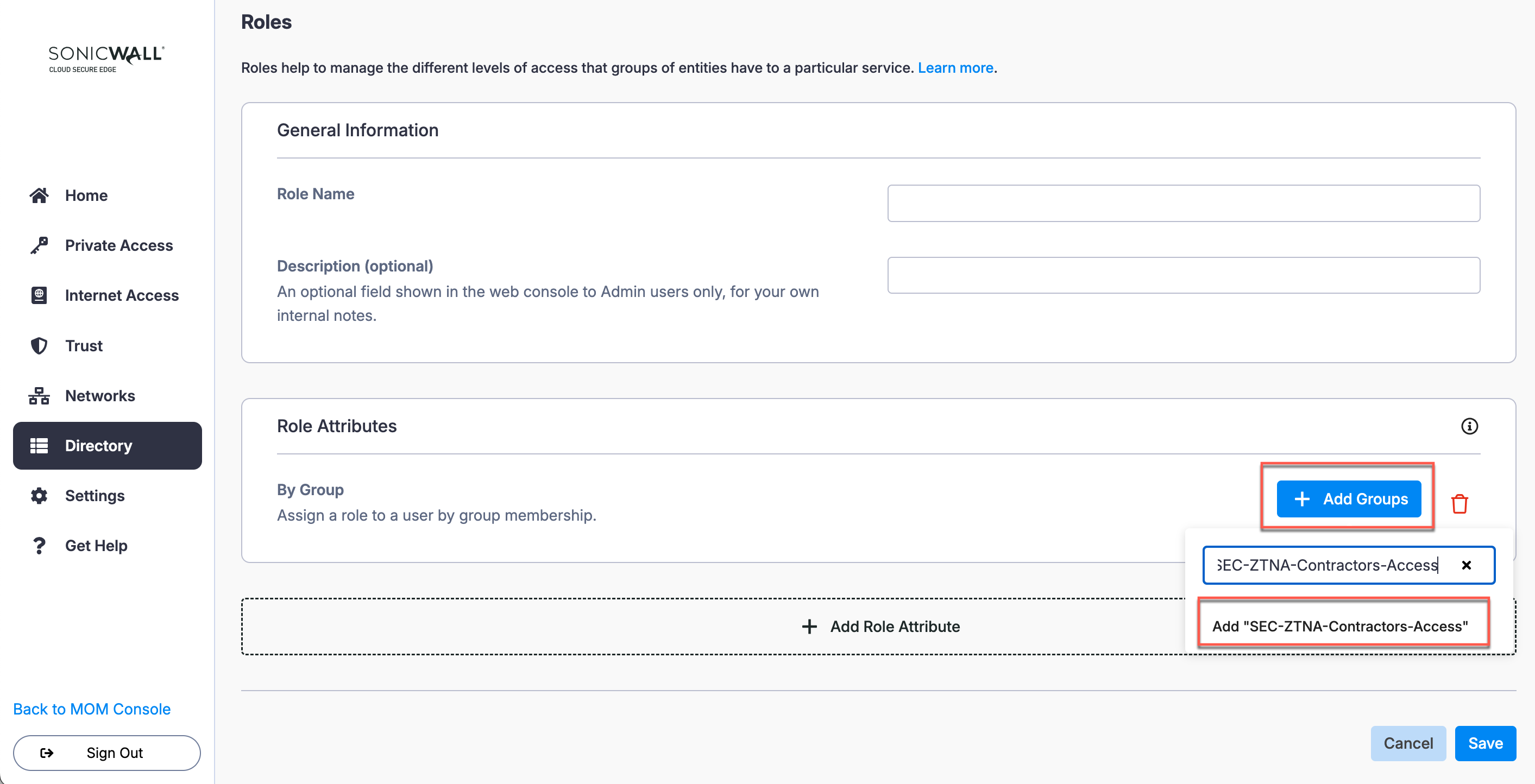 2.5 Under the Groups and Roles tab, select + Add group, and search for and select the SEC-ZTNA-Contractors-Access group (created in Section 1); Select this group.