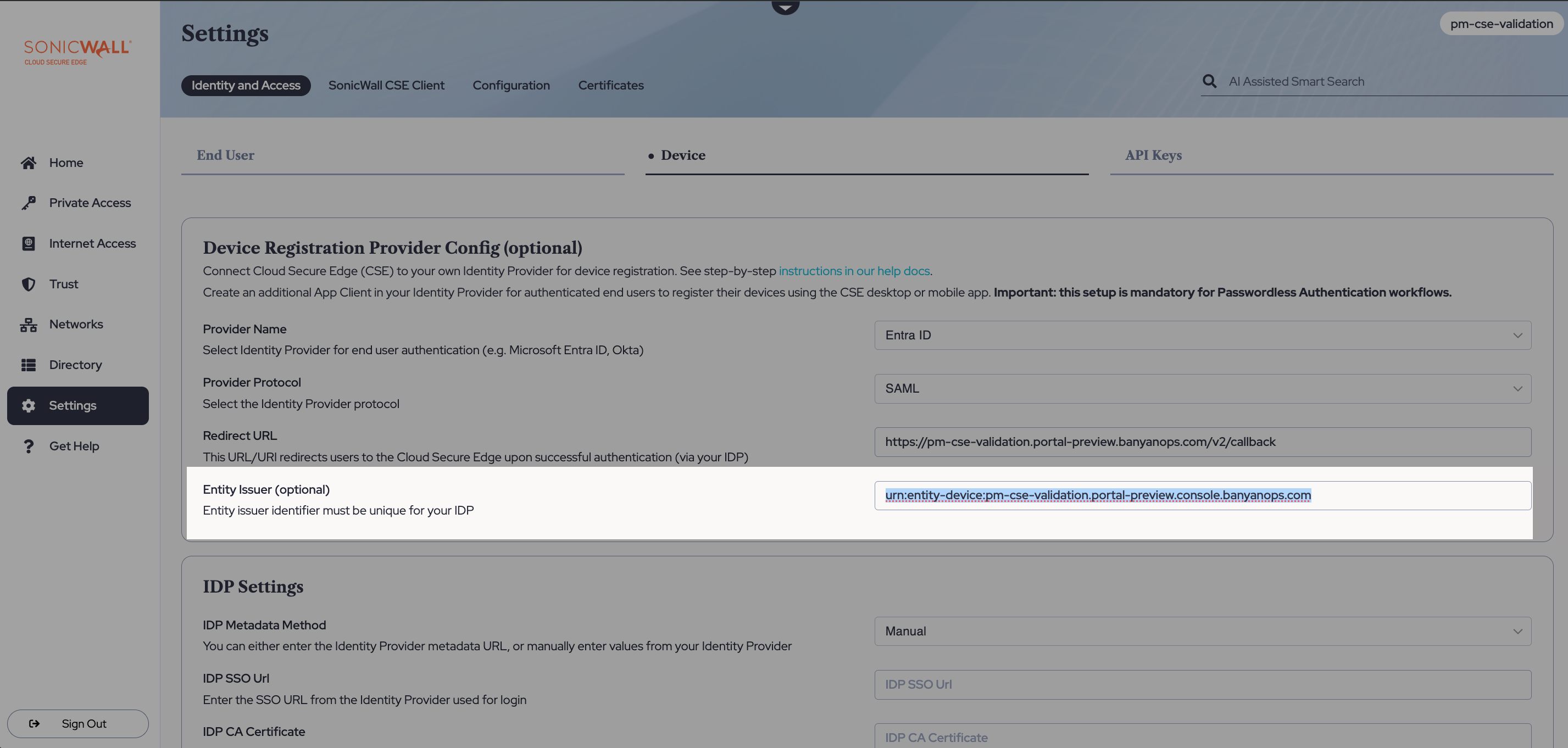 3.7 Back in the Cloud Secure Edge Command Center (under Settings > Identity and Access > Device, with Entra ID selected as the Provider Name and SAML selected as the Provider Protocol), copy the Entity Issuer.