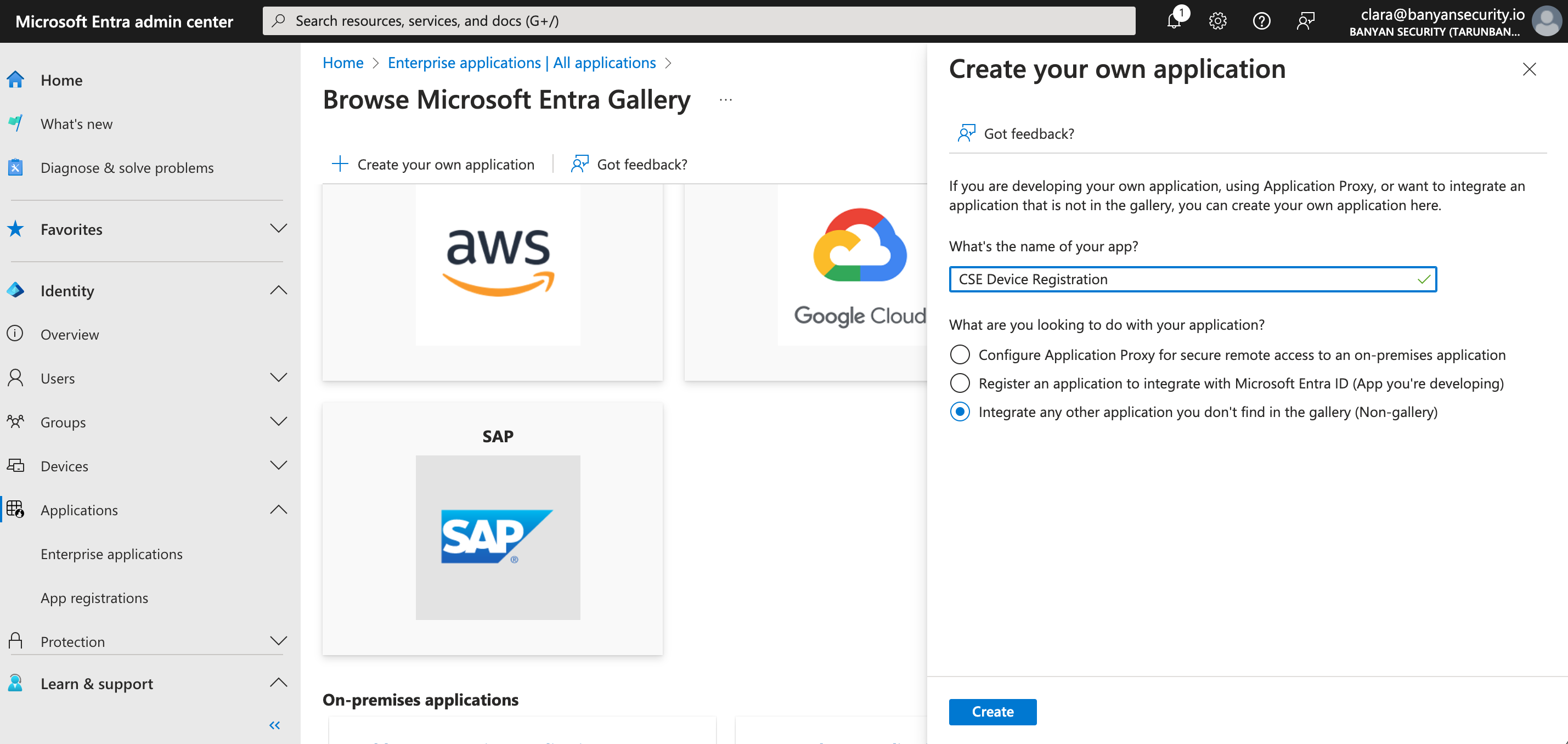 1.2 Select + New application, and then select Create your own application. This will generate a pop-out window on the right side of the webpage. In the What’s the name of your app? field, enter “CSE Device Registration”.