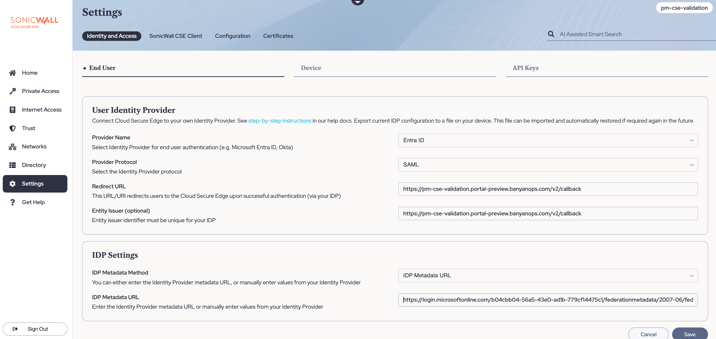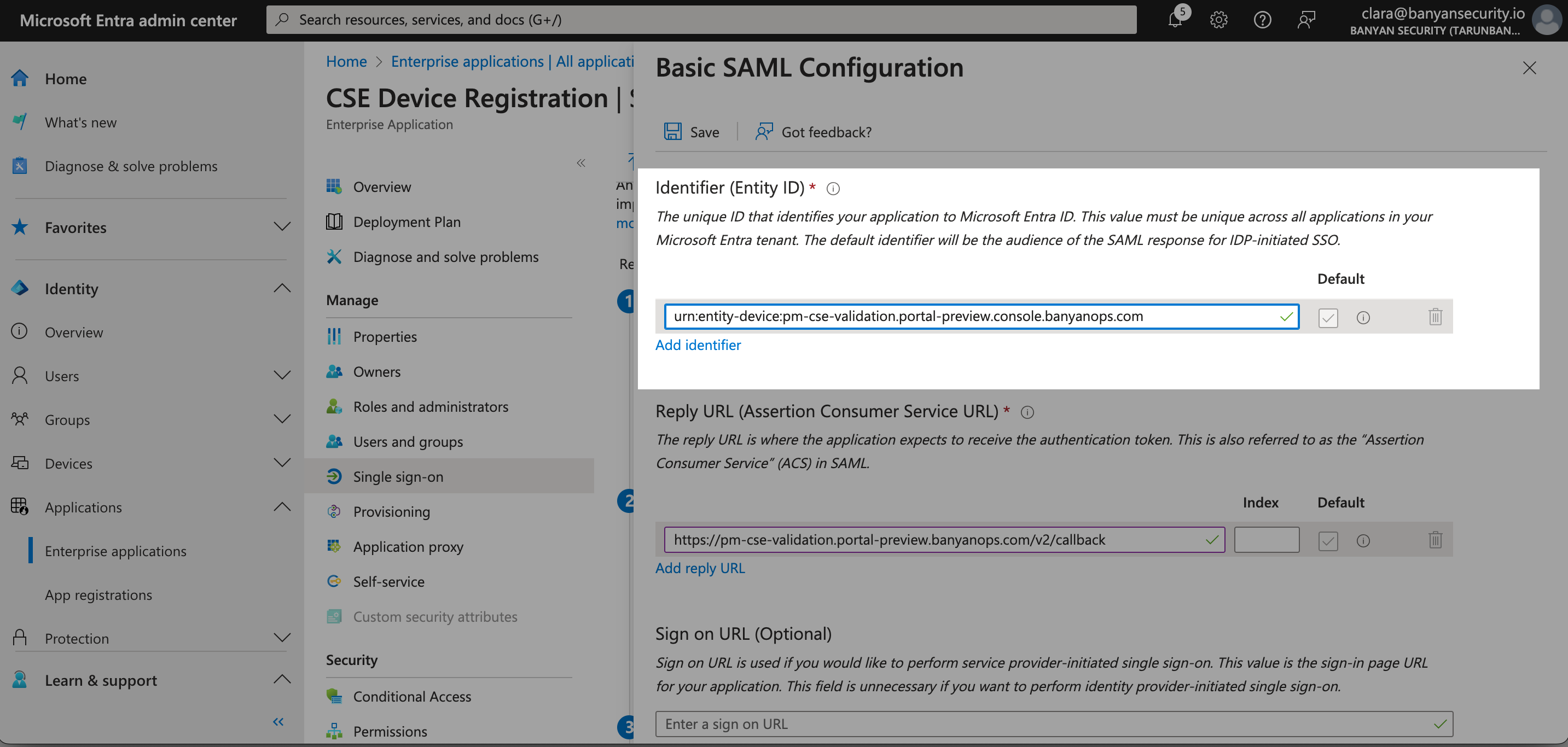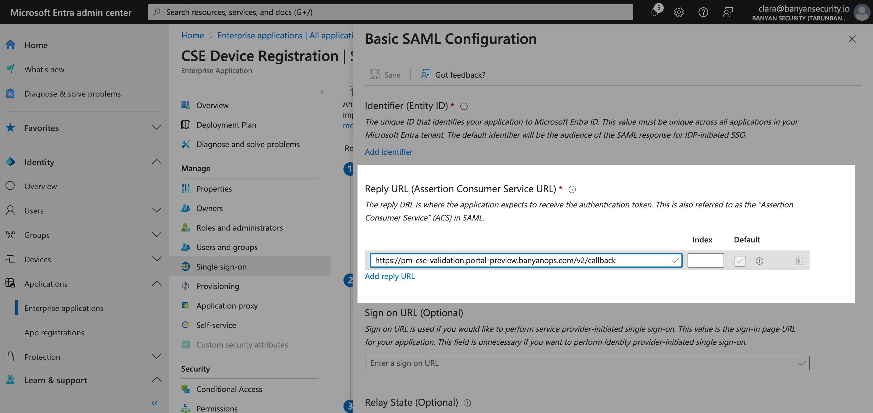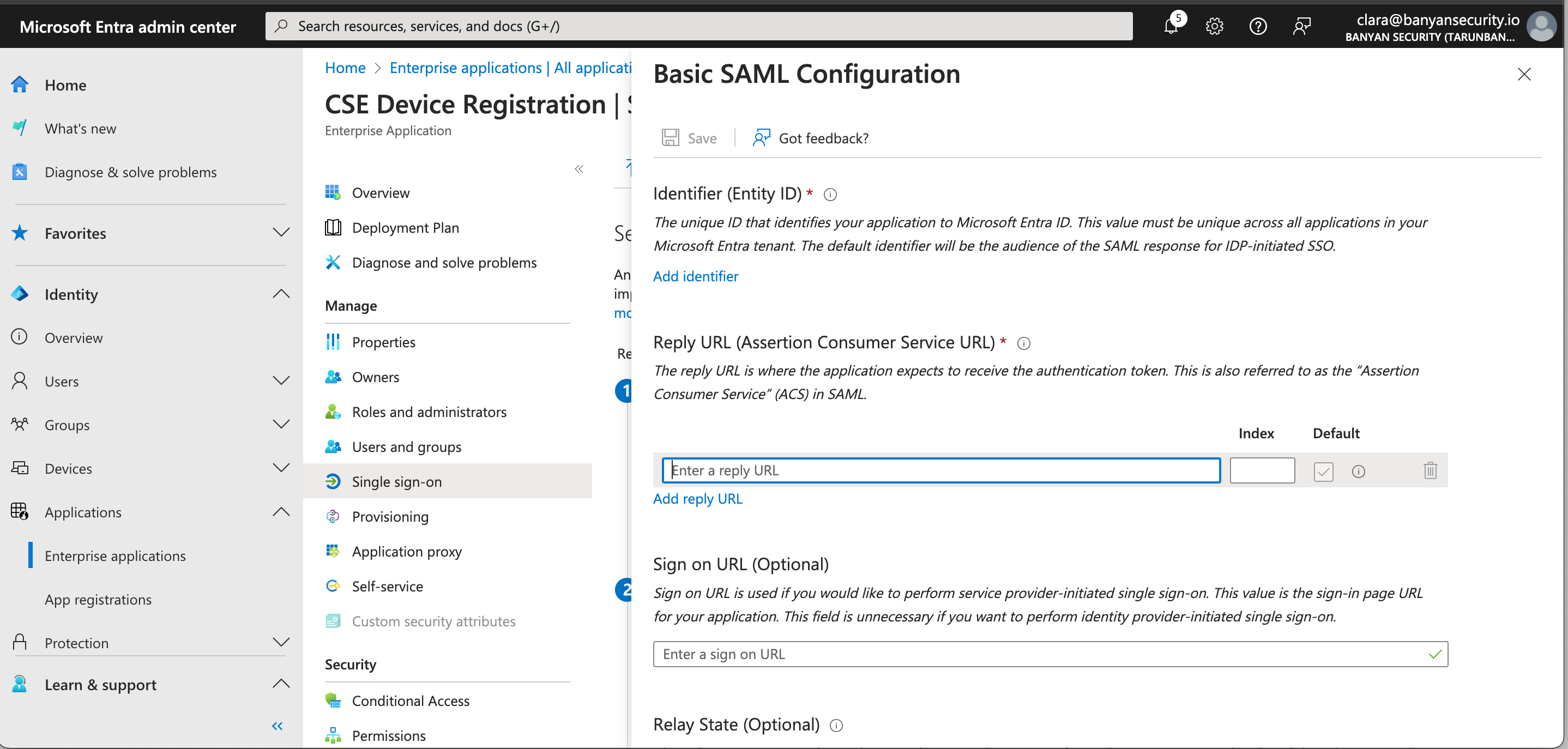 Note: The IDP metadata is evaluated daily. If there are any changes to the CSE Device Registration app in Entra ID, CSE picks up the changes via the metadata URL and applies these changes to your IDP configuration in the CSE Command Center.