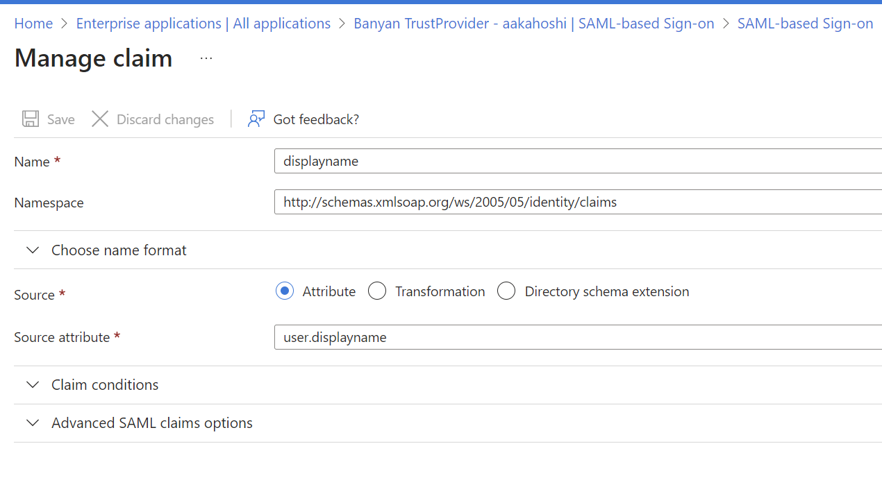 3.12 In the Name field, enter displayname. In the Namespace field, enter http://schemas.microsoft.com/identity/claims. Under Source, check Attribute, and in the Source attribute field, enter user.displayname.