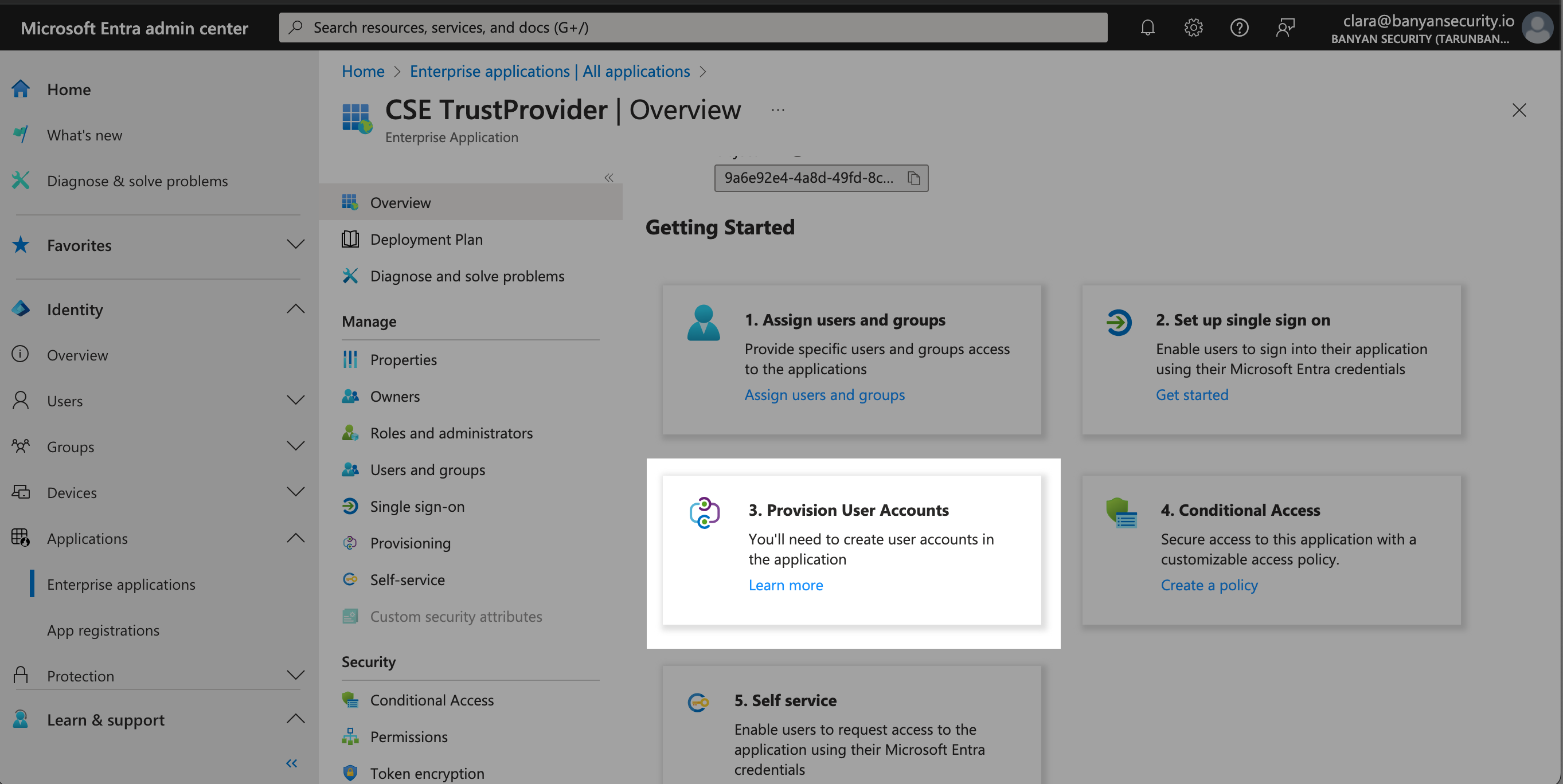 1.3 In your Entra admin center, navigate to your CSE TrustProvider App Overview page, and select 3. Provision User Accounts under Getting Started.