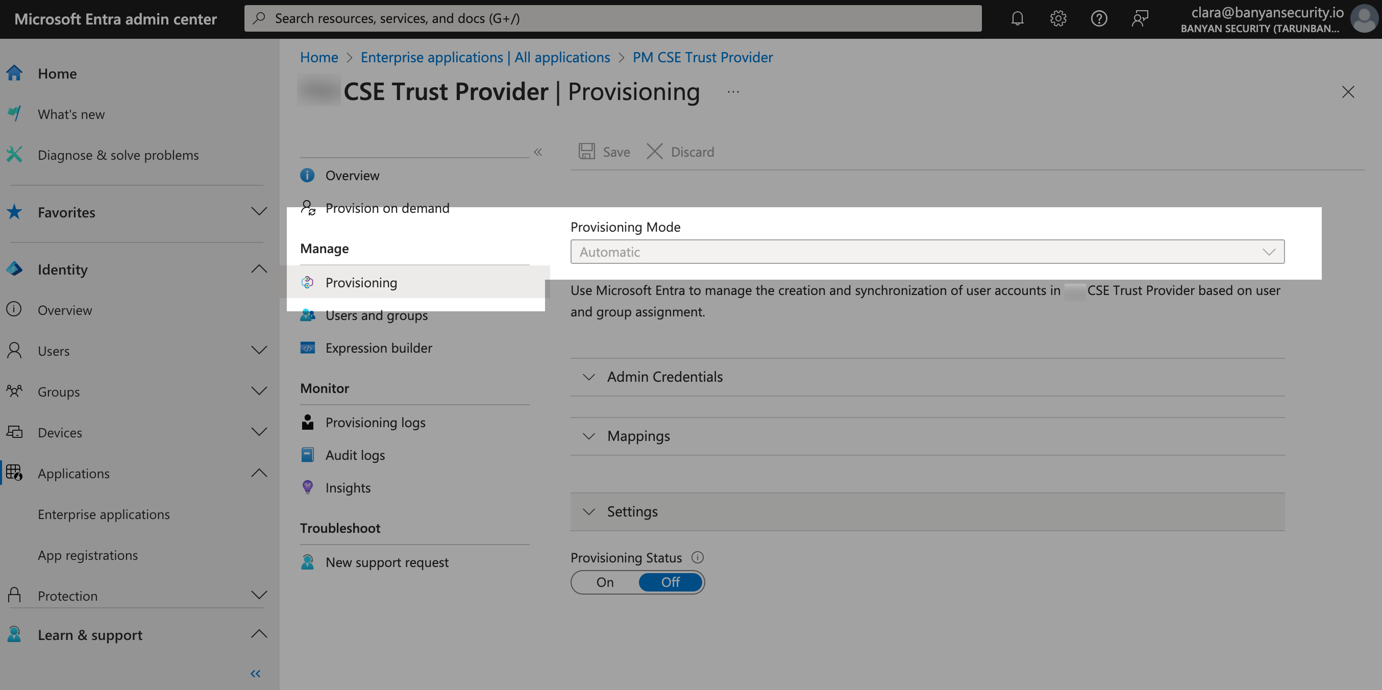 1.4 Under Manage (in the table of contents on the right side of the webpage), select Provisioning, and then under Provisioning Mode, select Automatic.