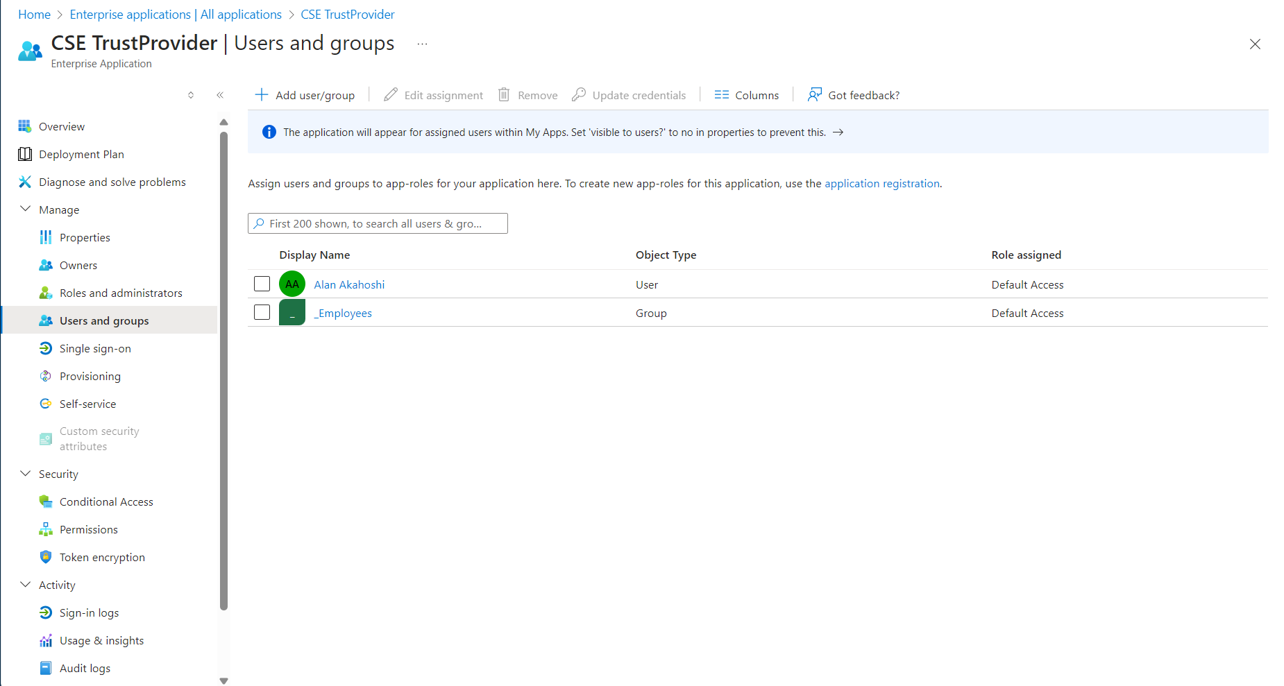 2.2 Add users, and assign roles to those users. If you want to assign your users to groups with friendly names, assign those users again to a group of your naming in your CSE TrustProvider app in Entra ID. Then, add the friendly-named group.