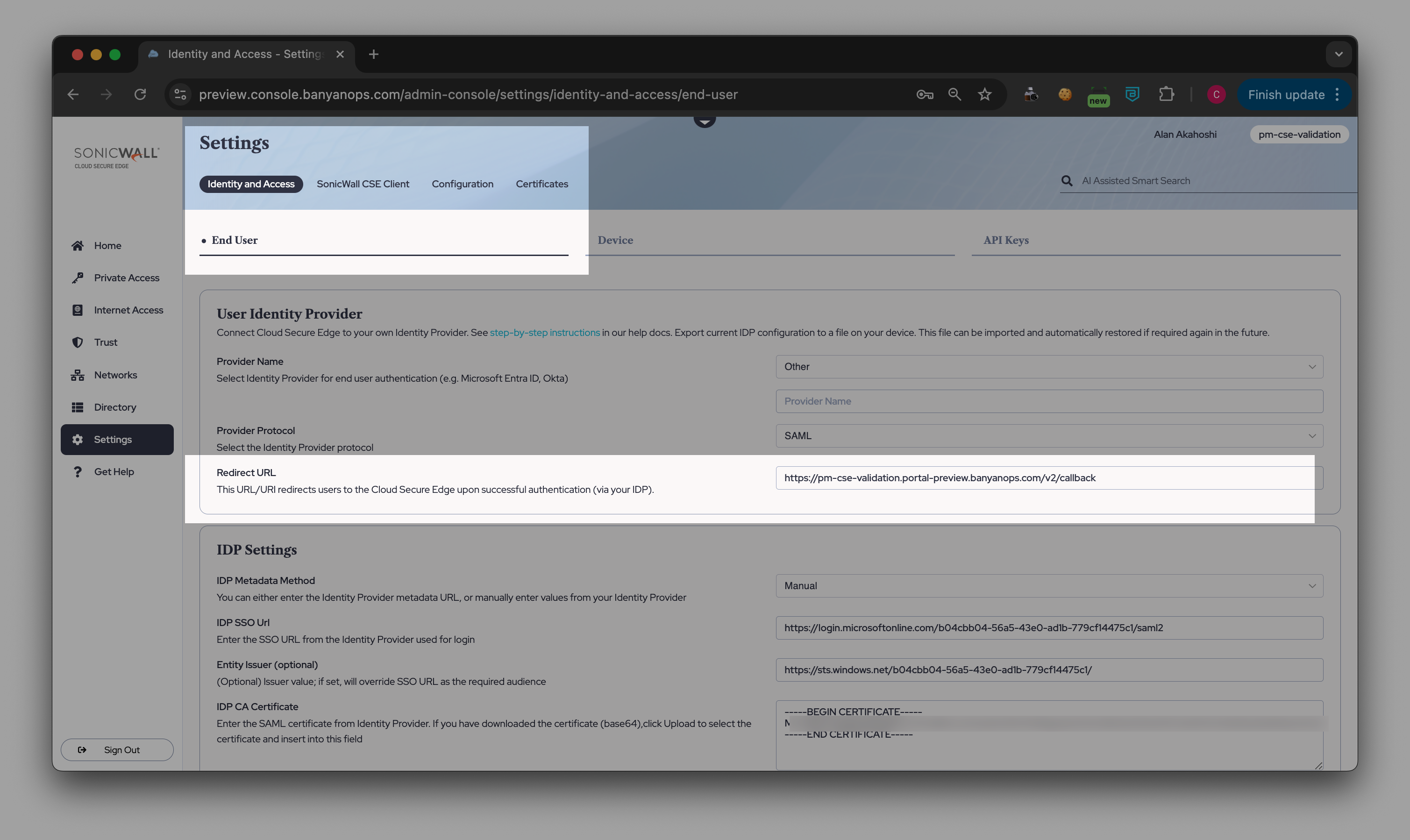3.7 Back in the Cloud Secure Edge Command Center (under Settings > Identity and Access > End User), copy the Entity Issuer.