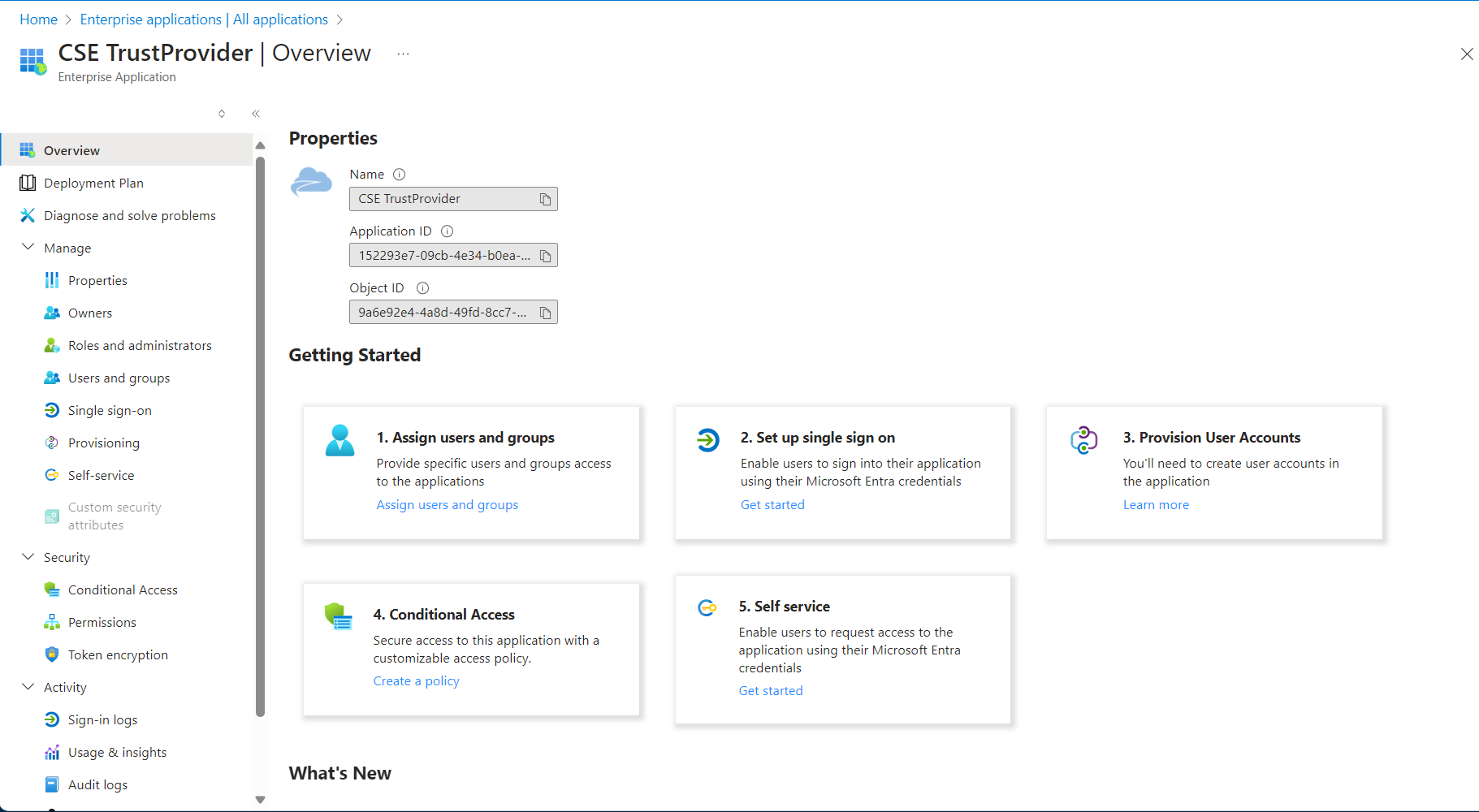 1.4 Select Create. This will navigate you to the new Overview page of the app you just added (i.e., CSE TrustProvider).