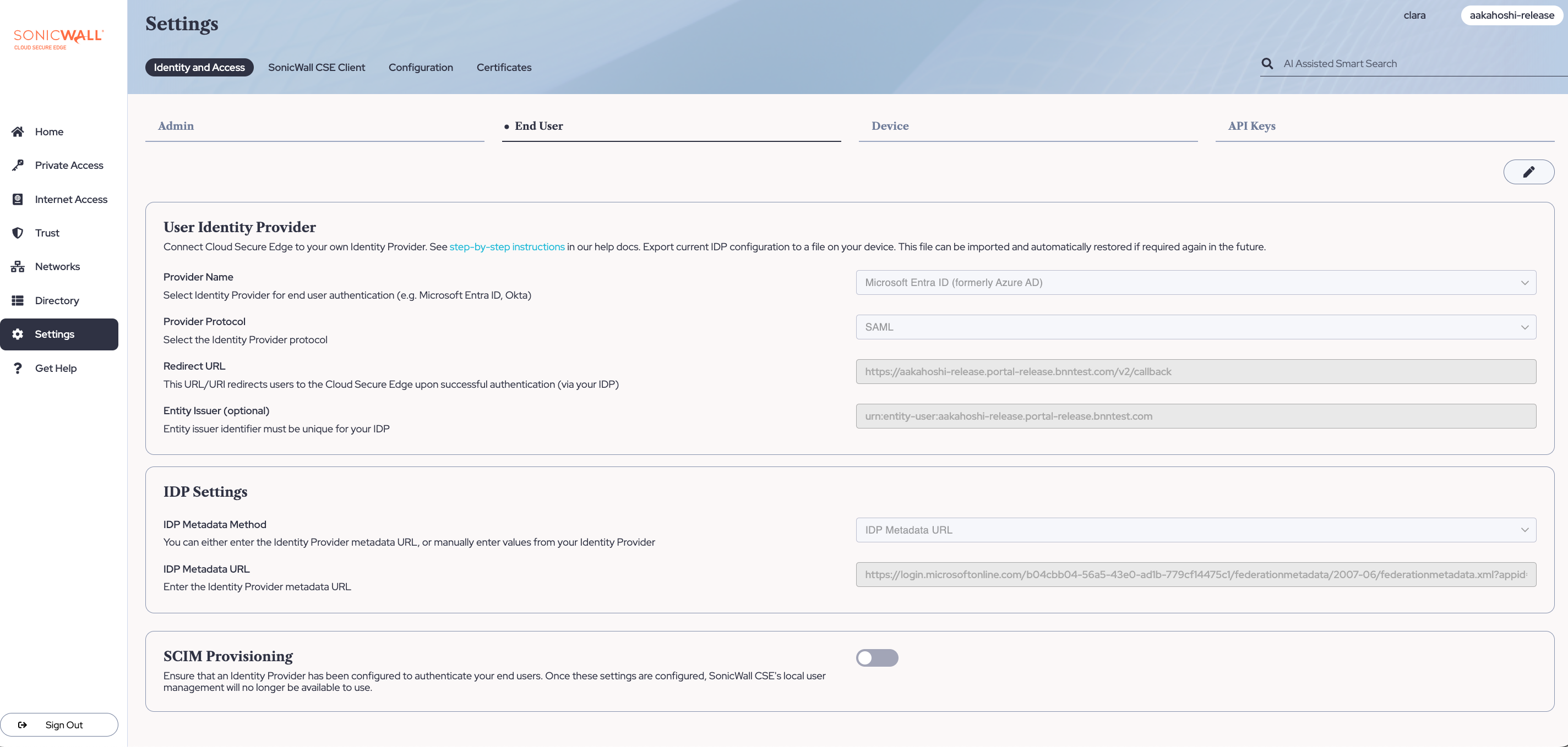 3.1 In the Cloud Secure Edge Command Center, navigate from Settings > Identity and Access > End User, and select Entra ID as the Provider Name.