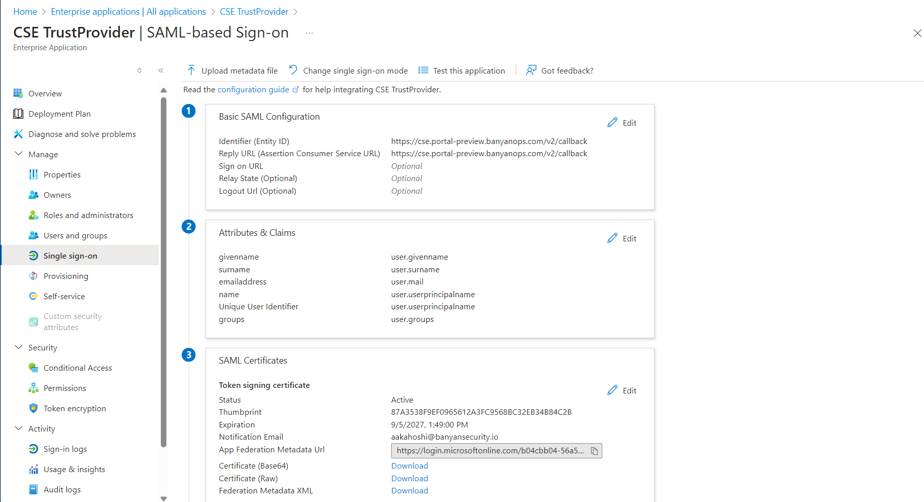 Note: The IDP metadata is evaluated daily. If there are any changes to the CSE TrustProvider app in Entra ID, CSE picks up the changes via the metadata URL and applies these changes to your IDP configuration in the CSE Command Center.
