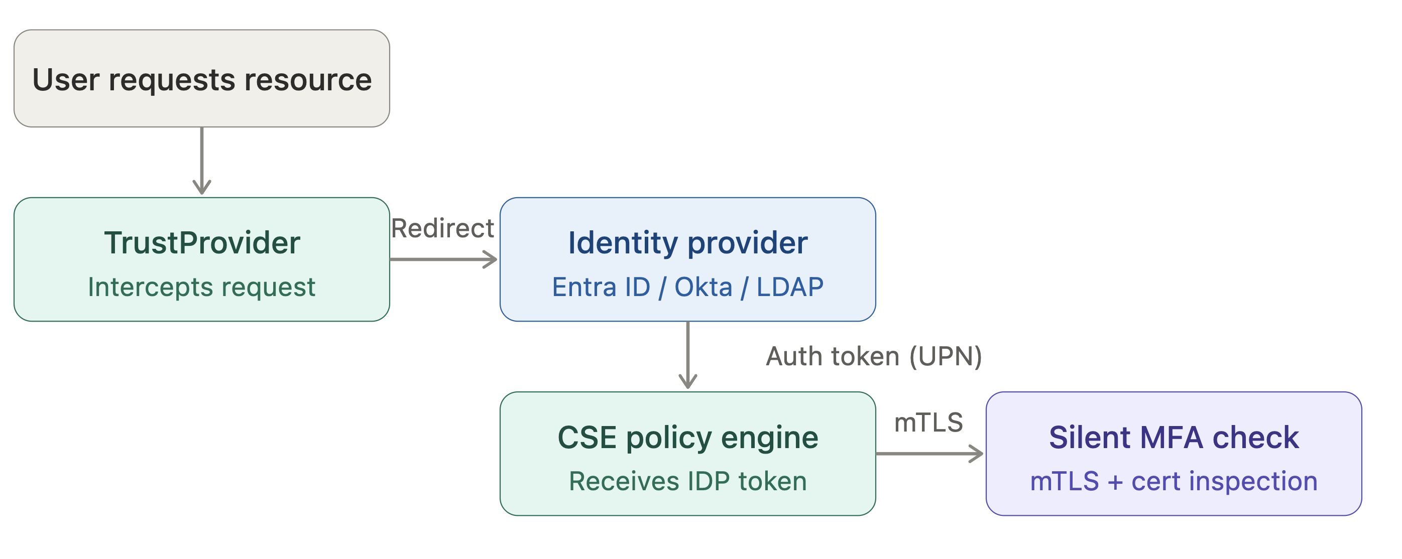 Use this doc to understand how CSE’s MFA architecture connects various factors - including user credentials, managed certificates, user principal names (UPNs), device serial numbers, and device Trust Scoring - to strengthen authentication weak points.