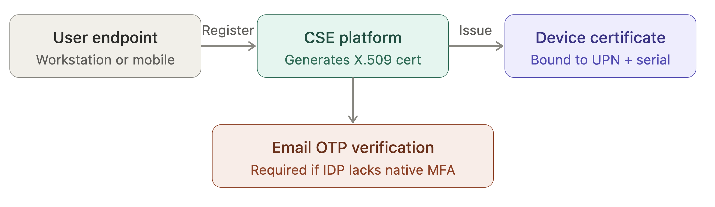 Orgs using legacy directories who want to migrate over to CSE’s certificate-based MFA can do so securely using CSE’s Email One-Time Password (OTP) verification feature, built specifically for the initial device registration phase. When a user attempts to register a new device, CSE automatically triggers an email containing a secure OTP, sent directly to the user’s corporate inbox. This creates an authentication bridge: