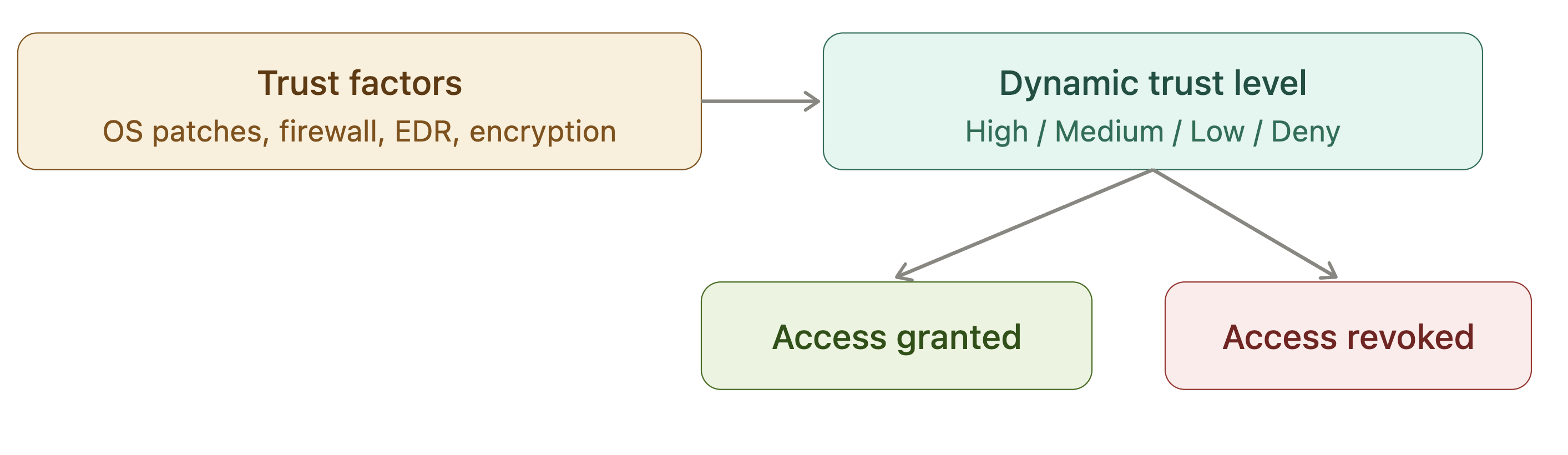 Based on these Trust Factors, CSE calculates a dynamic Trust Level (e.g., High, Medium, Low, or Always Deny). If an employee successfully logs in from their trusted corporate laptop, but disables their firewall mid-session, their Trust Level drops dynamically and blocks access. CSE can immediately amend or revoke access to sensitive resources—even if the user and device identities are valid.
