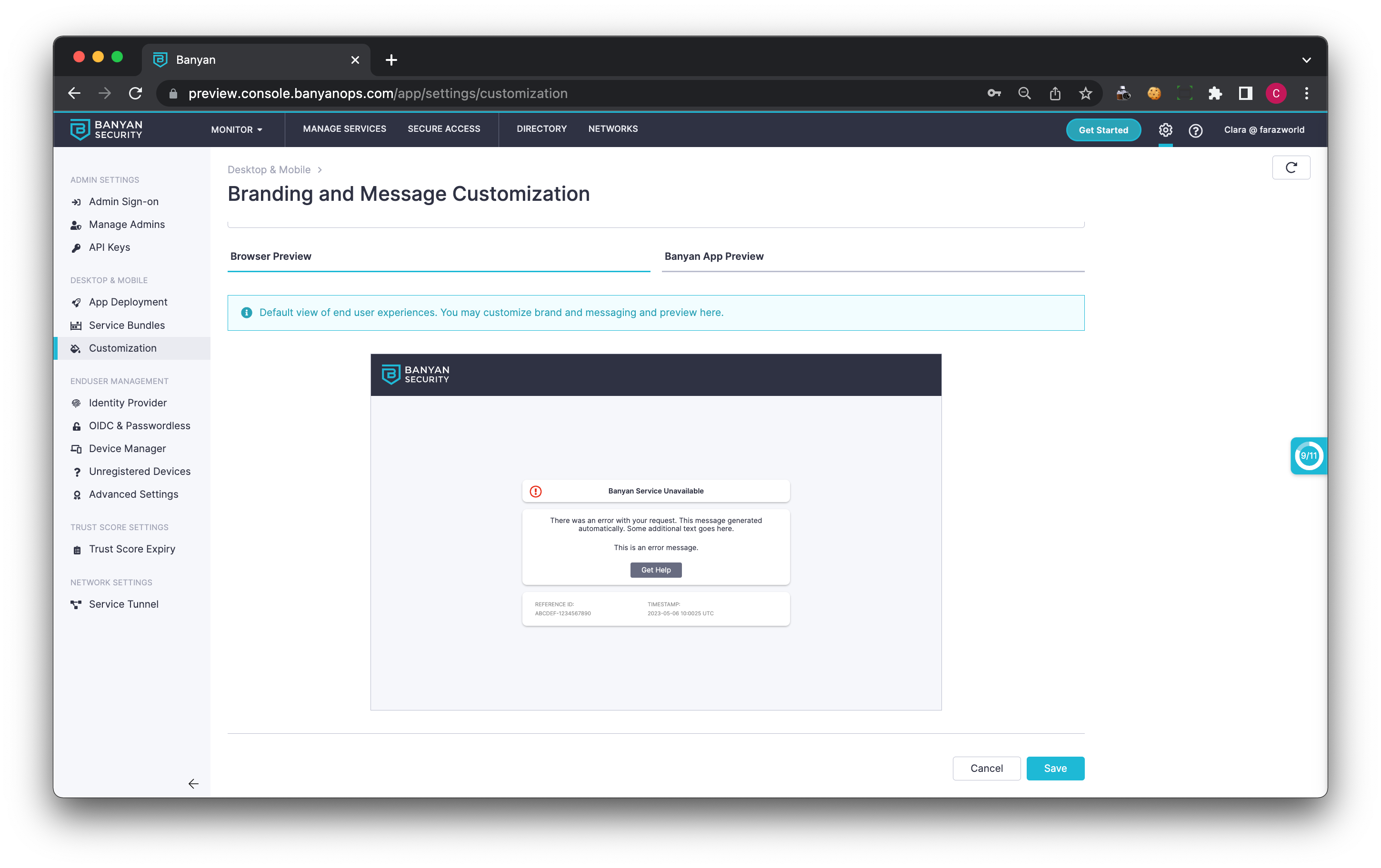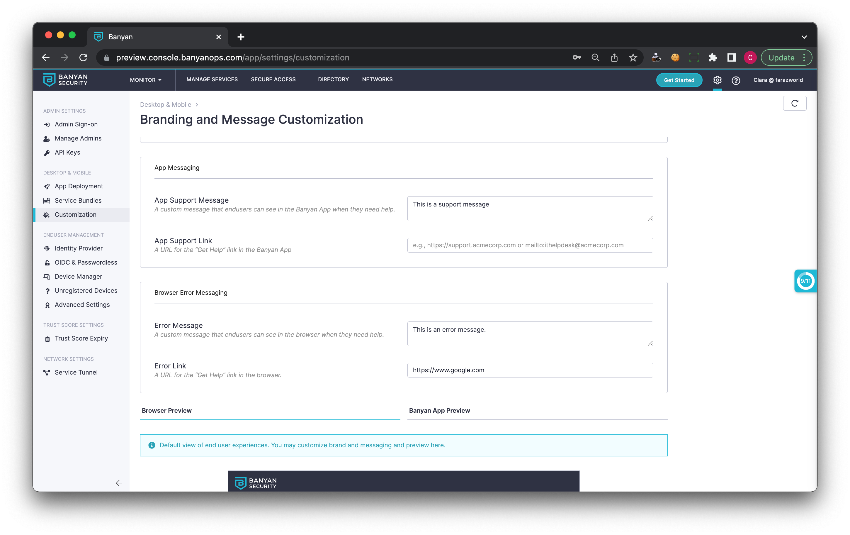 Admins can now use custom branding and create custom support messaging for end users from the Command Center. The brand customization allows admins to populate the Command Center and app with their organization’s own logo and brand colours. The messaging capability is designed to help guide end users through authentication and authorization errors.