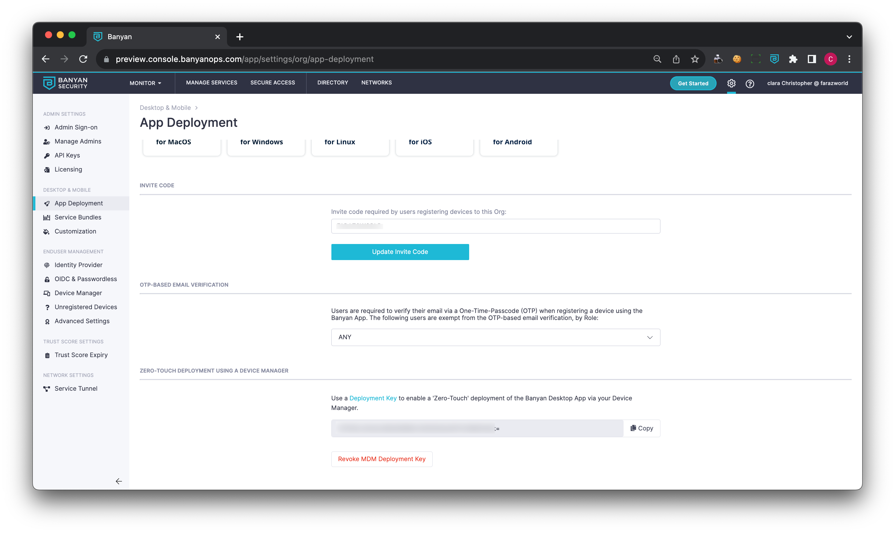 Obtain your organizations Invite Code and Zero Touch Deployment Key