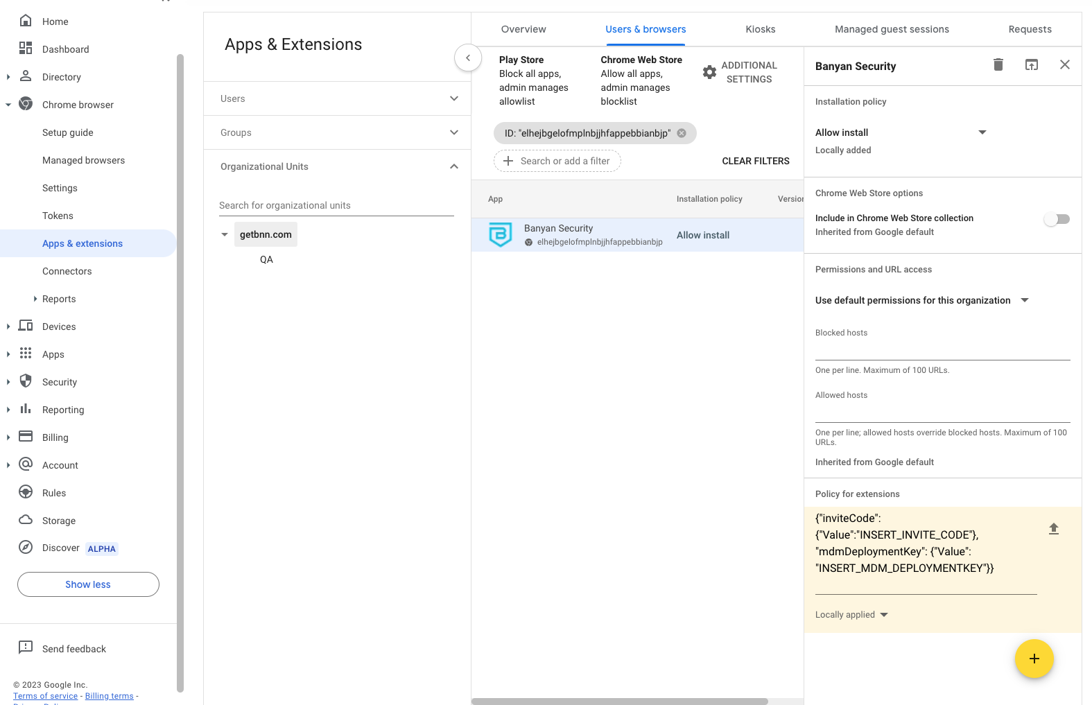 4 Enter the Policy for extensions, which can be configured by entering your org’s invite code and your mdm deploy key.