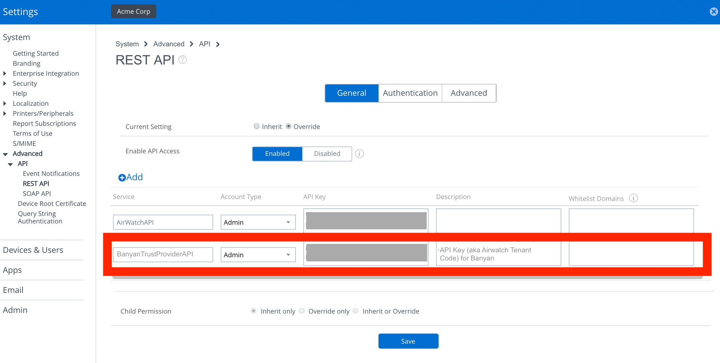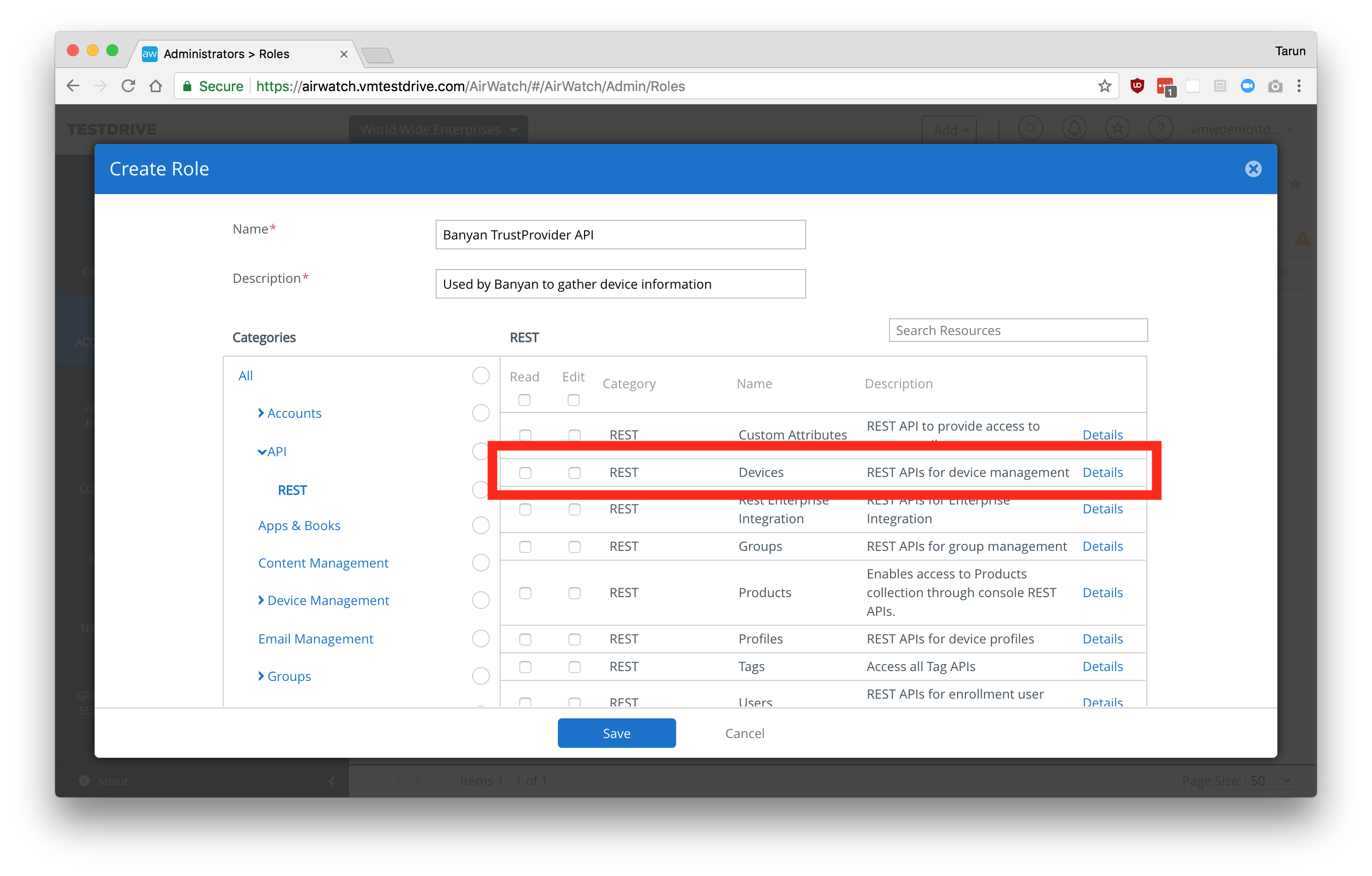 - A1. In the Workspace ONE UEM Console, create a Role for the CSE (formerly Banyan) API