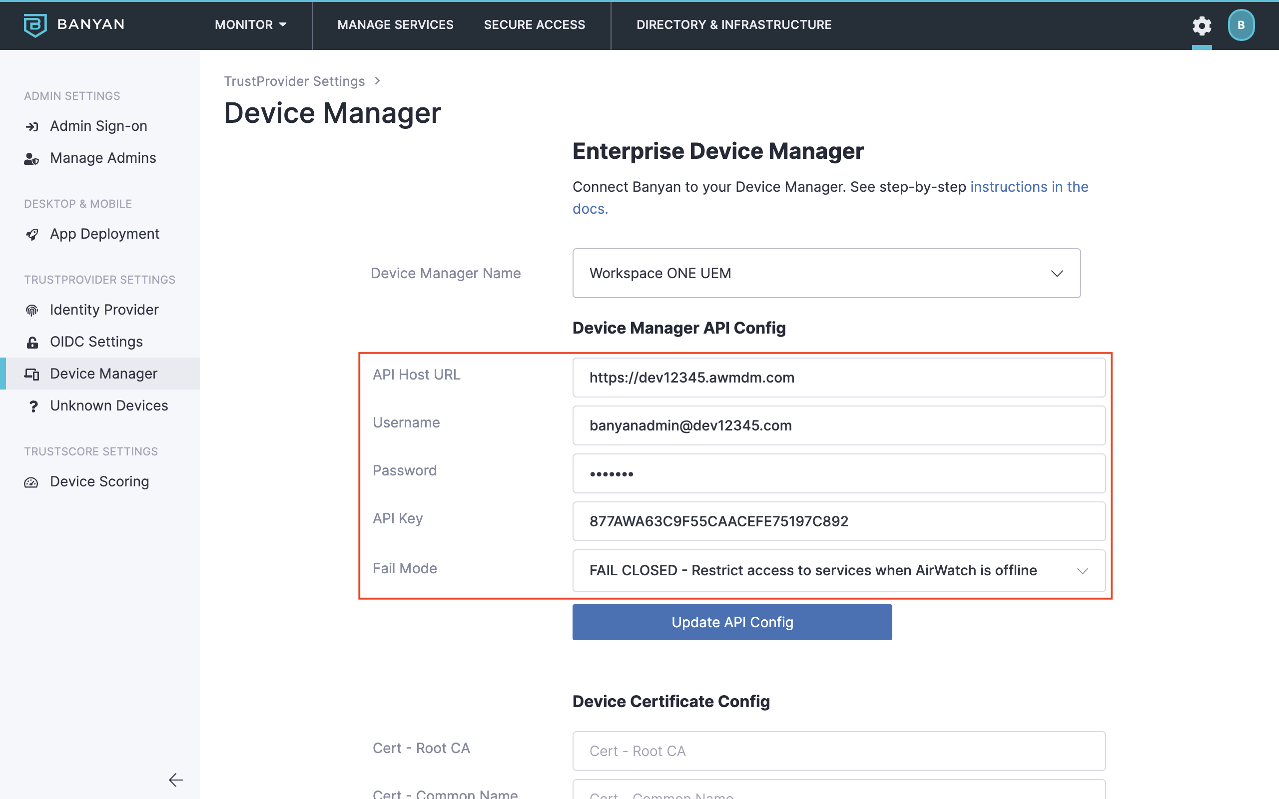 There are two main parts to configuring the Workspace ONE UEM-CSE integration. Part-A enables API access to gather data for Enhanced Trust Scoring. Part-B enables Device Identity using pre-installed device certs. You may complete either or both of these steps.