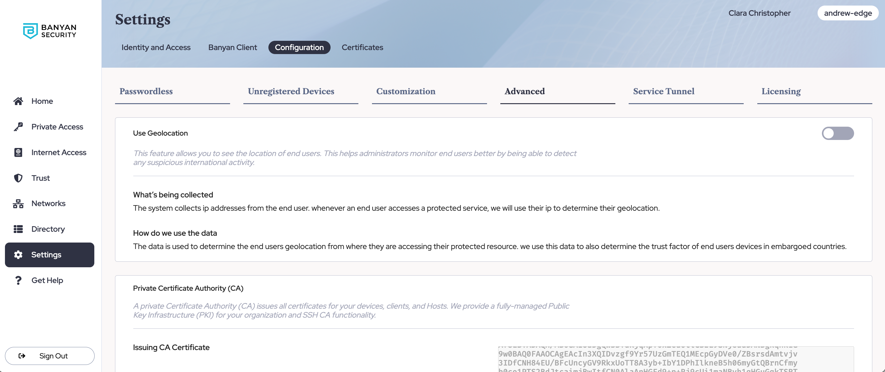 The Geolocation setting provides admins with visibility into the location of users’ devices by collecting devices’ IP addresses. Admins can turn the Geolocation toggle on or off via the Command Center in the Advanced Configuration setting.