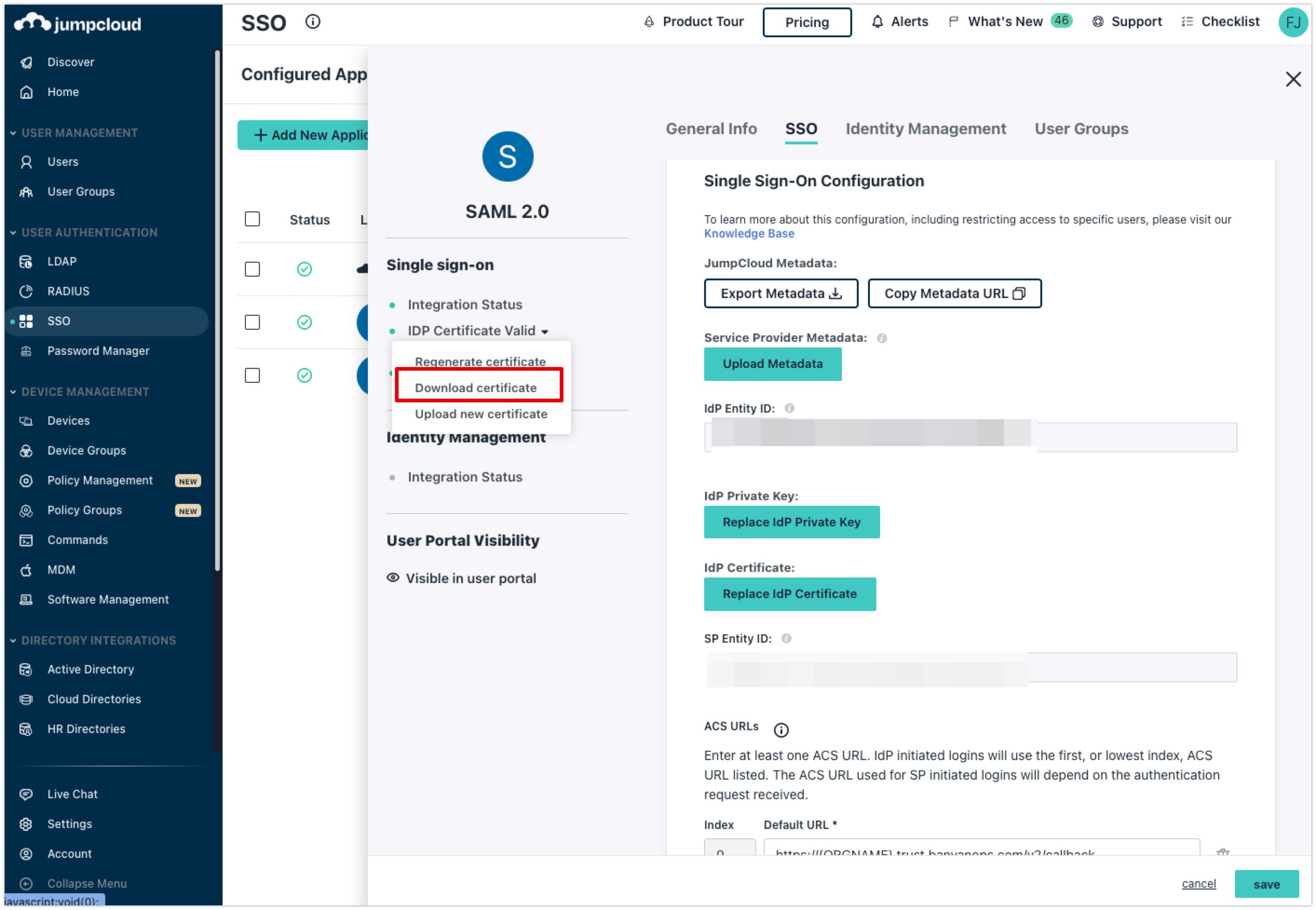 1.6 Download the IDP Certificate from the newly created SAML 2.0 App.
